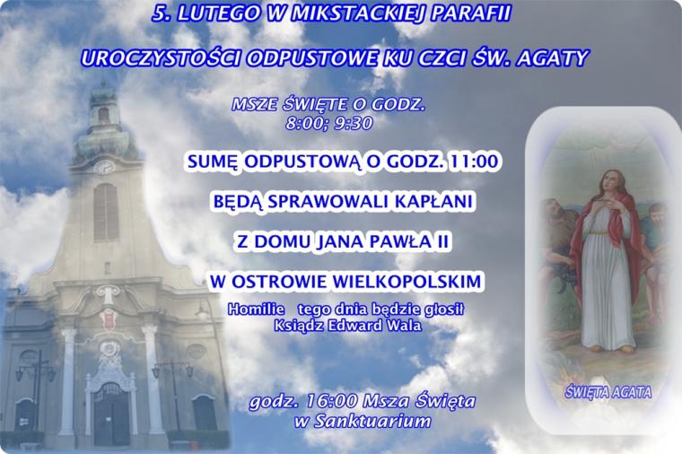 Suma odpustowa zostanie odprawiona 5 lutego o godz. 11:00 w kościele farnym pw. Świętej Trójcy w Mikstacie. Homilie w tym dni będzie wygłaszał KS.EDWARD WALA.