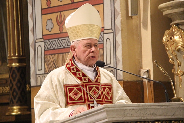 W homilii bp Napierała wskazał, że Jan Paweł II powołał do istnienia diecezję kaliską w święto Zwiastowania Pańskiego. – Wtedy urodziła się nasza diecezja i od razu była bogata, bo jako jedyna z tych trzynastu miała aż sześć części, które pochodziły z różnych diecezji. Cieszyliśmy się tą naszą diecezją. Zaczęliśmy ją budować, a tym tworzywem była wielość różnorodna. Od razu mieliśmy świadomość, że ta wielość jest bogactwem i trzeba wszystko robić, żeby tę wielość wspomagać, żeby ona mogła się rozwijać – powiedział celebrans. Wskazał na św. Józefa, który na początku istnienia diecezji nawiedził wszystkie parafie. - Patron diecezji, w kopii kaliskiego obrazu, pobłogosławionego przez papieża Jana Pawła II w czasie diecezjalnej pielgrzymki do Rzymu, i następnie „omadlanego” przez rok przez siostry zakonne w ich domach i klasztorach, przeszedł przez diecezję wzdłuż i wszerz na początku jej istnienia. Wszędzie był witany i przyjmowany z wiarą i miłością. Pobłogosławił diecezję i rozpoczął proces jej integracji – zaznaczył pierwszy ordynariusz kaliski. Przypomniał, że dziewięć lat trwały Misje Miłosierdzia Bożego prowadzone przez jezuitów, którym towarzyszył obraz Jezusa Miłosiernego. Dodał, że kolejnym wydarzeniem była peregrynacja kopii obrazu Matki Boskiej Częstochowskiej. – Jeśli św. Józef czasie swojej peregrynacji „przeorał” glebę serc diecezjan, to Jezus Miłosierny rzucił w nie ziarno swojej łaski, Maryja zaś zwieńczyła tamte dwa przejścia, przyciągając w czasie swojej peregrynacji ludzi do swej matczynej miłości. Tych troje: Jezus, Józef i Maryja dokonali tej zasadniczej integracji naszej diecezji – stwierdził kaznodzieja. Zaznaczył, że w szóstym roku istnienia diecezji przybył do jej stolicy Jan Paweł II. – Ojciec Święty przy Sanktuarium św. Józefa zgromadził nas na Eucharystii i tam wypowiedział te pamiętne słowa o najbardziej podstawowym prawie człowieka - prawie do życia od poczęcia do naturalnej śmierci. Te słowa zapadły nie tylko w kaliską ziemię, one są znane na całym świecie. Umieściliśmy je na pomniku Jana Pawła II dokumentującym historyczną wizytę Papieża w najstarszym z miast Polski – mówił hierarcha. Dodał, że od pięciu lat Kościół Kaliski prowadzi bp Edward Janiak, którego Pan wybrał do tego zadania. Stwierdził, że Kościół Kaliski jest żywą cząstką Kościoła Jezusa Chrystusa. – Z całym przekonaniem, z tym doświadczeniem dwudziestu lat mówię, że Bóg chciał tego Kościoła diecezji kaliskiej i dlatego mu błogosławi. Bóg chce, żebyśmy kochali ten Kościół i cieszyli się nim. To jest nasz Kościół, bo to jest Kościół Jezusa Chrystusa – akcentował bp Napierała.