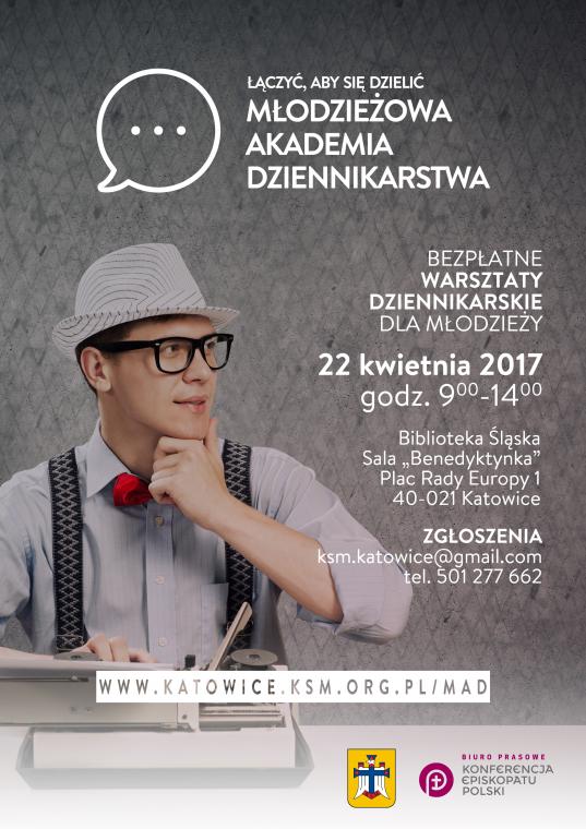 Szczegóły nt. Młodzieżowej Akademii Dziennikarstwa znaleźć można na stronie: www.katowice.ksm.org.pl/mad/ oraz w wydarzeniu na Facebooku: www.facebook.com/events/1759536254358934.