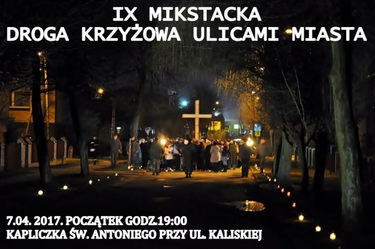 Już po raz dziewiąty mikstaccy parafianie wraz ze swoimi duszpasterzami wyruszą 7. kwietnia ulicami miasta za krzyżem Chrystusa, by rozważać tajemnice Jego Męki i Śmierci. IX Mikstacka Droga Krzyżowa, tradycyjnie prowadzi od Świętego Antoniego do Świętego Rocha. Początek o godzinie 19:00 przy kapliczce św. Antoniego na ulicy Kaliskiej. W tym miejscu stał kiedyś krzyż wykonany przez Pawła Brylińskiego, tu grzebano ofiary epidemii cholery. Zakończenie Drogi Krzyżowej przy Diecezjalnym Sanktuarium Świętego Rocha, który jest patronem od „morowego powietrza”. Warto dodać, że od 2007 roku św. Roch jest niebieskim Patronem miasta Mikstat.