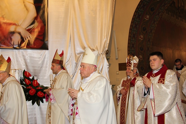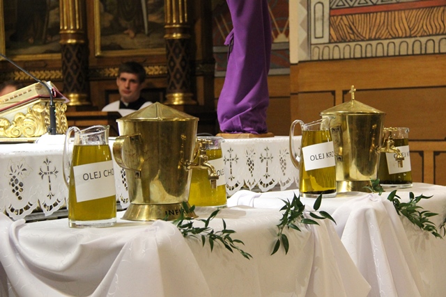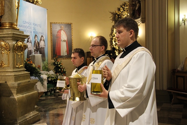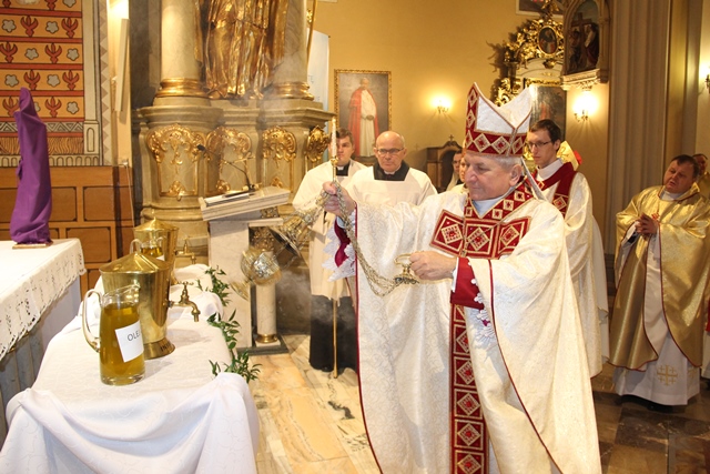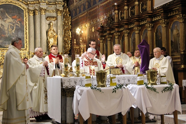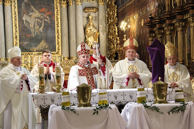 W homilii biskup kaliski zachęcał duchownych do odkrywania na nowo swojego kapłaństwa. – W roku jubileuszowym 25-lecia istnienia diecezji kaliskiej staramy się na nowo odkryć tożsamość kapłańską, aby jeszcze gorliwej pracować w winnicy Pańskiej. Wewnętrzna formacja kapłańska z natury rzeczy nastawiona jest na ciągły rozwój i wzrost – mówił celebrans. Podkreślał, że kapłani poprzez Słowo Boże, sakramenty święte i ewangelizację budują Kościół święty, który jest komunią, a nie organizacją użyteczności publicznej. – Niestety, wielu publicystów wypowiadających się na łamach prasy na temat Kościoła, chciałoby go sprowadzić tylko do jakiejś organizacji charytatywnej lub filantropijnej – powiedział kaznodzieja. Dodał, że akcja charytatywna to tylko jeden z aspektów działalności Kościoła, ważny, ale nie najważniejszy. – Zadaniem Kościoła jest misja zbawienia człowieka i w tę misję musi być wpisane nasze kapłaństwo – stwierdził bp Janiak. Zaznaczył, że współczesny świat jest dotknięty laicyzmem, który eliminuje z życia człowieka obecność Boga, wartości nadprzyrodzone i moralne kryteria oceny postępowania ludzi. – Z drugiej strony mamy do czynienia z fundamentalizmem religijnym, który prześladuje i morduje w imię religii, w imię Boga, co jest niezgodne z elementarnym poczuciem zdrowej religijności. W tę optykę współczesnej cywilizacji i globalizacji wrzucony jest kapłan, aby mimo wszystkich przeszkód głosił Dobrą Nowinę o zbawieniu – wskazywał hierarcha. Prosił wiernych o modlitwę w intencji księży. – Zwracam się do Was, drodzy wierni, abyście swoją modlitwą wspierali swoich duszpasterzy. Przez dobrą i harmonijną współpracę można dokonać wiele szlachetnych dzieł w parafiach, do których należycie. Niech Wasza dyspozycyjność będzie zachętą dla kapłanów, by jeszcze gorliwiej pracowali dla zbawienia dusz – mówił ordynariusz kaliski. Podziękował księżom za posługę w diecezji kaliskiej. – Chciałbym Wam serdecznie podziękować za Waszą pracę dla dobra Kościoła Kaliskiego. Ten Kościół jest Waszą matką, a matkę trzeba kochać i wiernie jej służyć – powiedział bp Janiak. W czasie uroczystej liturgii biskup kaliski poświęcił krzyżmo oraz oleje chorych i katechumenów.