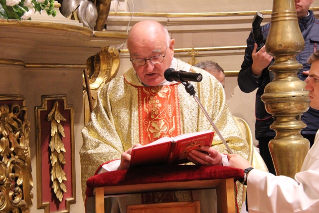 Po komunii św. ks. Tadeusz Kosecki z Gdyni, były więzień obozu w Stutthofie, w Kaplicy Cudownego Obrazu św. Józefa Kaliskiego oczytał akt zawierzenia św. Józefowi ułożony 72 lata temu przez księży z Dachau.
