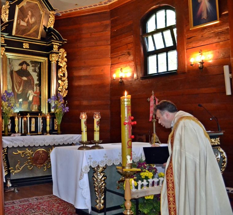 Nabożeństwo poprowadził w sanktuarium ks. kan. Krzysztof Ordziniak, który przewodniczył modlitwie oraz odczytywał poszczególne rozważania spotkań. Podczas nabożeństwa zapalony był paschał, od którego przy rozważaniu kolejnego spotkania odpalana była świeczka.