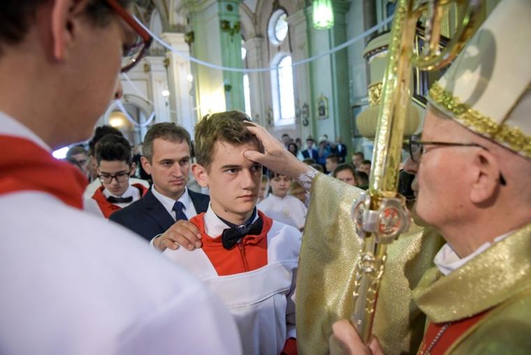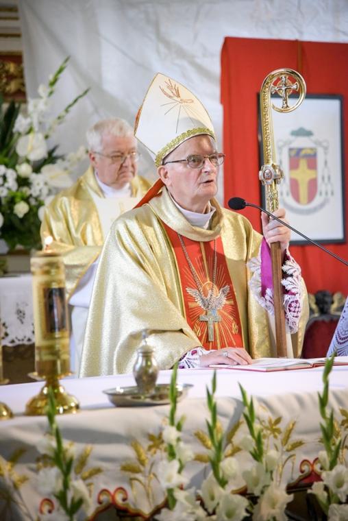W czasie sumy 53 młodych parafian mikstackich z rąk Ks. Biskupa przyjęło Sakrament Bierzmowania, a wraz z nim Dary Ducha Świętego, które mają pomagać im w mężnym wyznawaniu wiary, w dawaniu świadectwa o Chrystusie w codziennym życiu. W tym dniu przeżywały także zakończenie „Białego Tygodnia” dzieci, które w Uroczystość Zesłania Ducha Świętego po raz pierwszy przyjęły Pana Jezusa do swego serca. Na początku Mszy Świętej ks. kan. Krzysztof Ordziniak, proboszcz mikstackiej parafii poprosił ks. bpa o przewodniczenie uroczystej sumie odpustowej oraz o udzielenie Sakramentu Bierzmowania młodzieży. Przed homilią ks. bp poświęcił krzyże, które mają młodym przypominać o przyjętym sakramencie dojrzałości chrześcijańskiej. W homilii ks. bp Teofil Wilski pochylił się nad tajemnicą Trójcy Świętej. Rozpoczynając homilię powiedział: „Trójca Święta to wielka tajemnica naszej wiary. Bóg jest jeden w Trzech Osobach. Ta prawda jest niezgłębiona, bo Bóg jest niezgłębiony. Skoro człowiek jest ograniczony, stworzony nie może przeniknąć do końca nieskończoności Boga”. Jednak jak podkreślił kaznodzieja, sam Bóg już w Starym Testamencie powiedział nam coś ważnego o sobie, co ważne jest także dla naszego życia. Szczególnie ważna i cenna dla zebranych w mikstacki wieczerniku była ta część homilii, która zawierała wskazania odnoszące się do codziennego życia. Ks. biskup wskazał, że mimo, iż Trójca Święta jest tajemnicą „ Bóg chce nam jednak odsłonić rąbka tego swego wewnętrznego życia, a także przez to powiedzieć coś ważnego o sobie samym, o nas samych”. Ks. Bp zaznaczył, że Ojciec posyła na świat swego Syna, Jezus objawia Ojca, ale także Jego miłość i miłosierdzie. Kaznodzieja wskazał na nieustanne poddawanie się i pełnienie woli Bożej przez Jezusa. Ks. Bp wskazując na znaczenie Ducha Świętego w życiu Syna Bożego powiedział: „W swoim człowieczeństwie naznaczony jest od początku Duchem Świętym. Ten Duch jest Jego mocą, Jego miłością”. Bóg, jak podkreślił ks. bp powiedział nam dużo o swoim wewnętrznym życiu. Podkreślił, że ponieważ człowiek stworzony został na obraz i podobieństwo Boże, jeśli w życiu naśladuje Boga, osiąga godność i cel, do którego został stworzony. Ks. bp podkreślił, że Jezus wypełniając swoje posłannictwo oddał za nas swoje życie. Powinno to stanowić dla nas zachętę do tego byśmy nie bali się ofiarować swego życia Bogu i innym. W dalszej części rozważania ks. bp wskazał przykłady Świętych, którzy oddali swoje życie w służbie Bogu i bliźnim. Powiedział: „Ten, który daje, ofiarnie służy innym ten jest wielki w swoim człowieczeństwie w świetle Bożych dróg”. Biskup Senior wskazał młodym pola działania, które pomogą im stać się ludźmi wielkimi, na których mogą realizować się służąc Bogu i bliźnim. Zwrócił uwagę na zagrożenia jakie niesie współczesny świat zapominający o Bogu, przykazaniach, prawdzie. Kolejna część homilii została poświęcona darom Ducha Świętego. Ks. bp wyjaśnił znaczenie poszczególnych darów w życiu człowieka. Kończąc kaznodzieja nawiązując do przeżywanego przez ks. kan. Zbigniewa jubileuszu podkreślił znaczenie posługi kapłańskiej, zachęcając jednocześnie młodych do refleksji nad swoim powołaniem. Po homilii miało miejsce wyznanie wiary. Młodzi odpowiadali na pytania ks. bpa o wiarę, były to te same pytania, na które przed laty odpowiedzieli za nich rodzice. Następnie ks. bp wraz z kapłanami w geście wyciągniętych rąk modli się o dary Ducha Świętego dla przyjmujących Sakrament Bierzmowania. Po zakończonej modlitwie miało miejsce namaszczenie czoła olejem Krzyżma Świętego, któremu towarzyszą słowa formuły sakramentalnej: „Przyjmij znamię daru Ducha Świętego”.