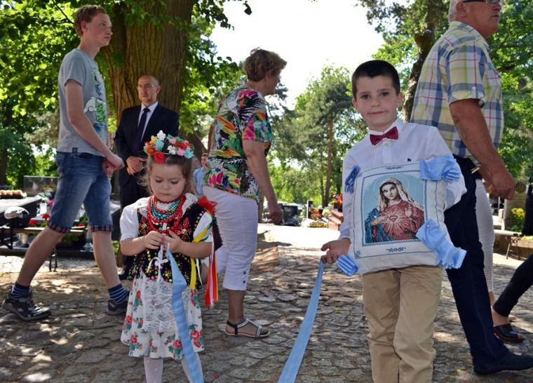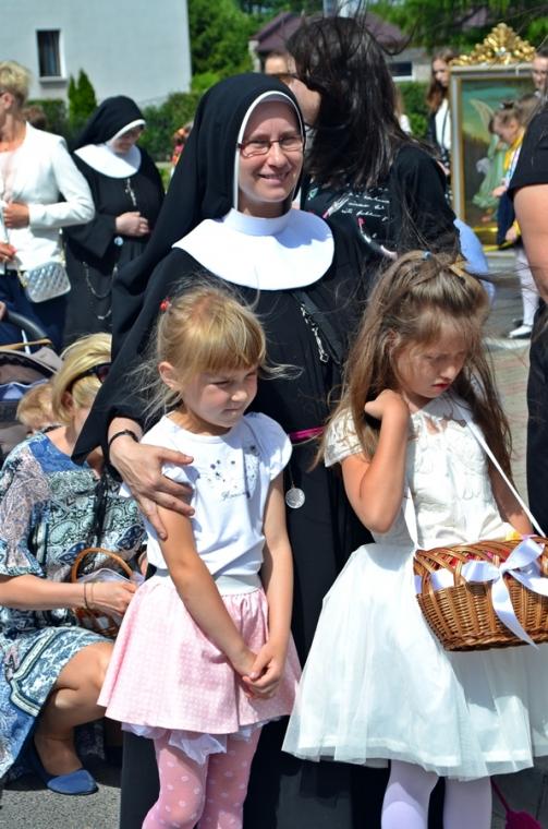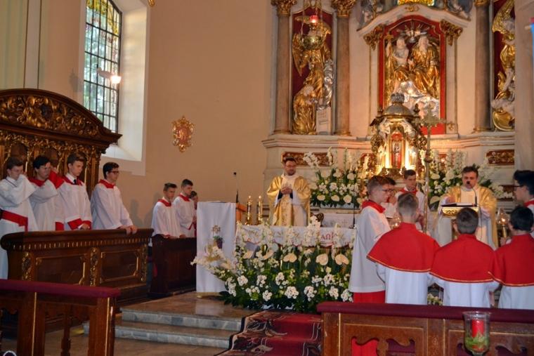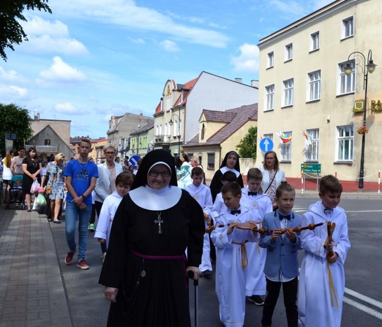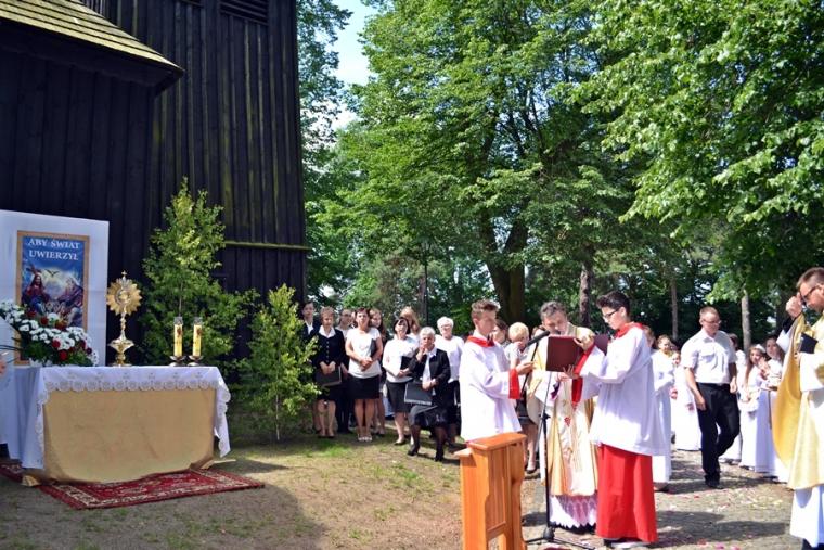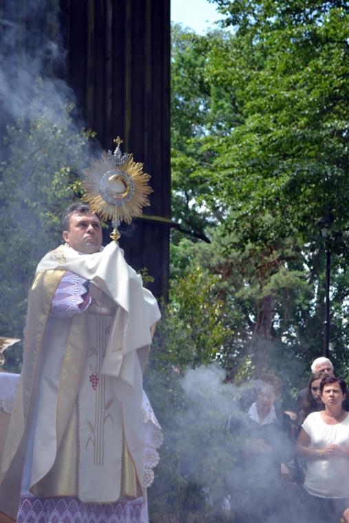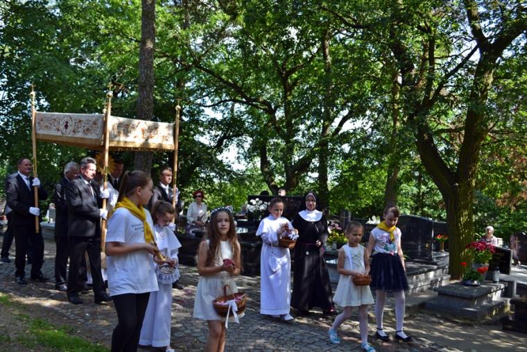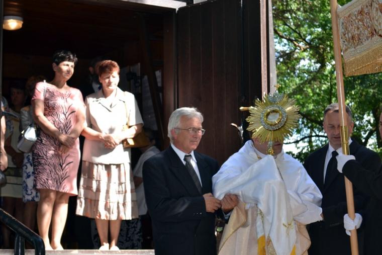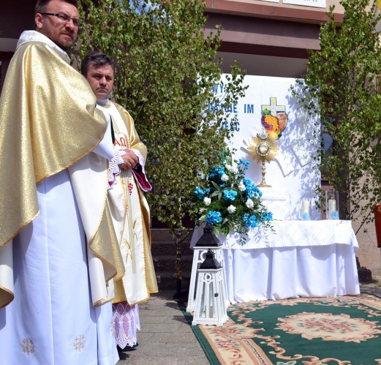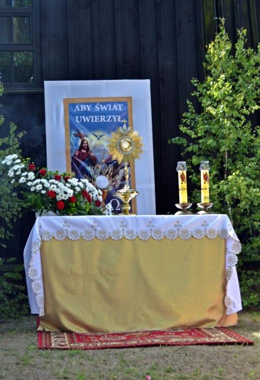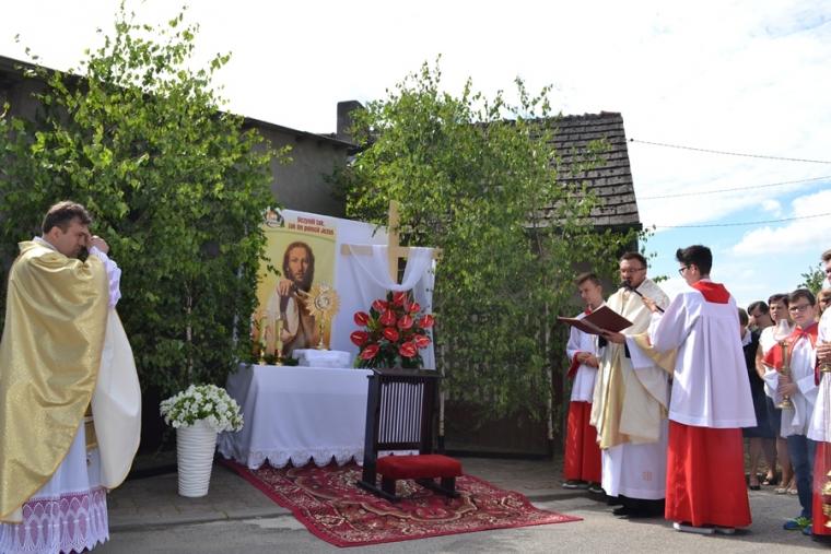 Po Mszy Świętej przed wystawionym Najświętszym Sakramentem, odmówiliśmy Litanię do Serca Jezusowego. Następnie wraz z Jezusem ukrytym pod postacią Chleba wyruszyliśmy w procesji do czterech ołtarzu. Krzyż, chorągwie, feretrony, poduszki z emblematami religijnymi niesione przez dzieci poprzedzały w procesji Jezusa ukrytego pod postacią Chleba niesionego w monstrancji. Tuż przed kapłanem niosącym monstrancje szły dziewczynki sypiące kwiatki. Pięknie przygotowane zostały ołtarze.