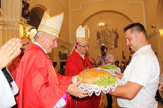 Życzył mieszkańcom parafii, aby byli złotymi kłosami tej ziemi. - Dzisiejsza uroczystość parafialna jest lekcją wiary, aby ją pogłębić, ożywić, aby uświadomić, że to my wszyscy jesteśmy złotymi kłosami ziemi stoleckiej. Życzę, abyście byli złotym plonem waszej parafii, diecezji kaliskiej, Kościoła w Polsce, naszej ojczyzny na miarę ziarna św. Wawrzyńca, które wpadłszy w ziemię nie umarło, ale ożyło i żyje po wieki, na miarę ziarna spalonego w Oświęcimiu o. Maksymiliana Kolbe, na miarę ziarna ks. Jerzego Popiełuszki, syna ziemi podlaskiej, na miarę ziarna ks. mjr. Ignacego Skorupki, który przy miedzy polnej pod Radzyminem padł w czasie napadu bolszewickiego. Bądźcie złotymi kłosami waszej ziemi, Kościoła i naszej ojczyzny i to jest plon na tegoroczne dożynki – powiedział metropolita gdański.