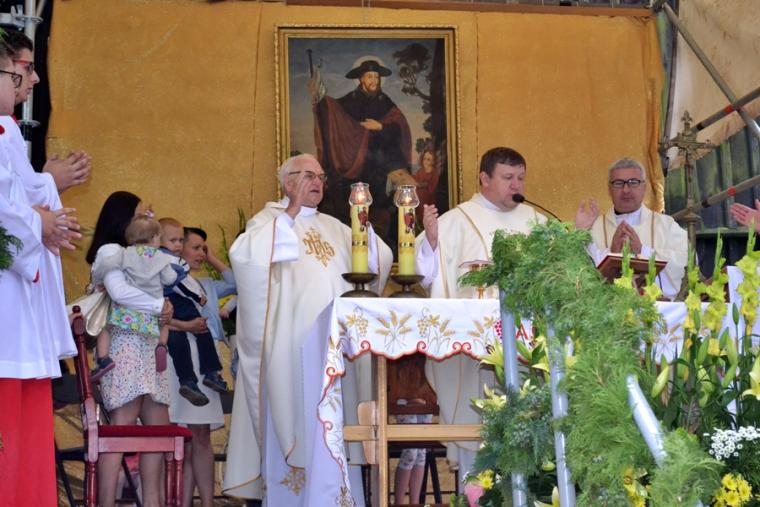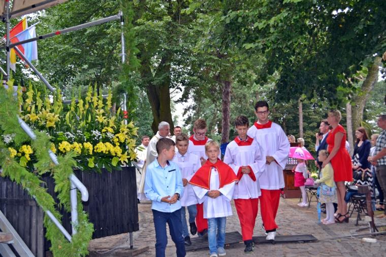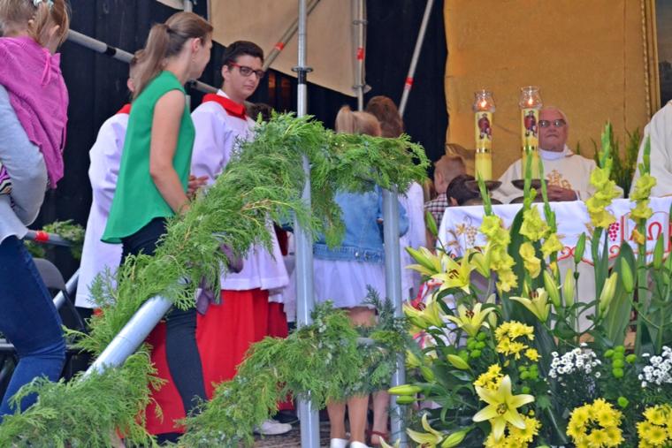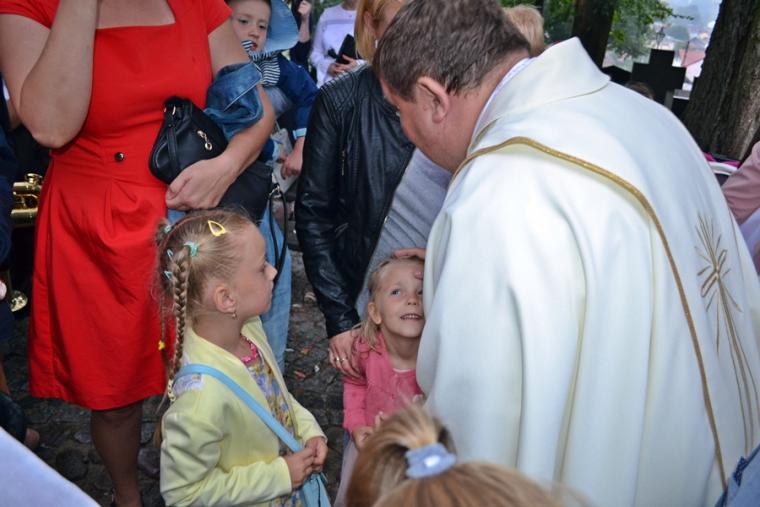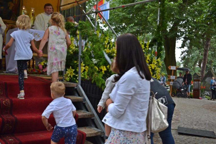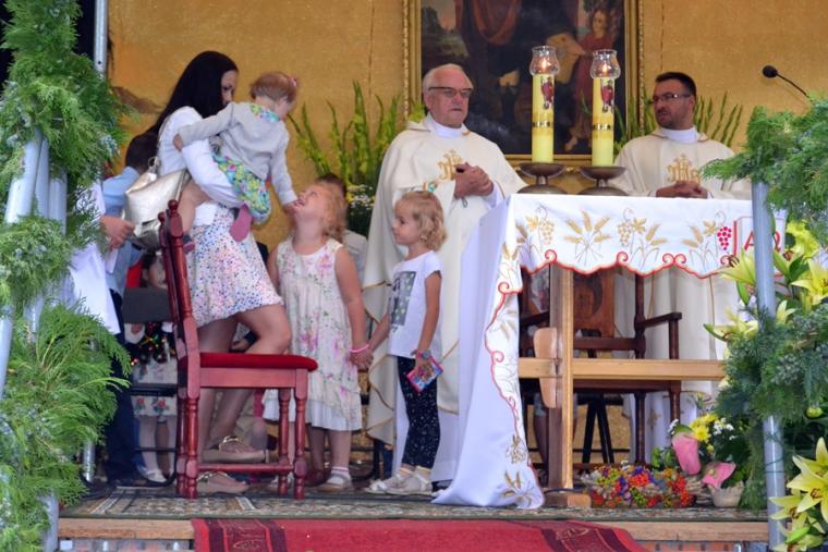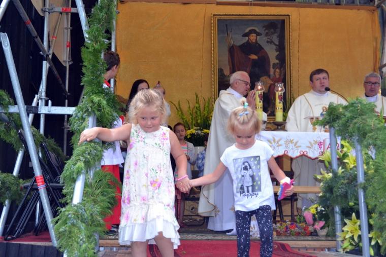 Czas wielkiego świętowania rozpoczął się procesją z Najświętszym Sakramentem i relikwiami Świętego Rocha z kościoła farnego do sanktuarium, zakończył jej powrotem. Zanim procesja z Najświętszym Sakramentem wyruszyła z sanktuarium do fary wyjątkowo gwarno zrobiło się wokół niego. W dniu uroczystości odpustowych przybyły wraz ze swoimi rodzicami do św. Rocha dzieci. Tu o godz. 18:00 ks. kan. Bogumił Kempa sprawował w ich intencji Mszę święta oraz skierował do wiernych rozważanie. Krótko po rozpoczęciu Eucharystii zaczął padać deszcz. Ksiądz Bogumił zaprosił dzieci, by zgromadziły się przy ołtarzu, bo zostało nad nim przygotowane zadaszenie. Na początku homilii kaznodzieja powiedział, że pierwszy raz głosi ją w takim towarzystwie. Wyraził radość z obecności tak wielu dzieci w sanktuarium u św. Rocha. Podkreślił, że dzieci przybyły tu po błogosławieństwo, które czyni człowieka szczęśliwym. Wyjaśniając istotę błogosławieństwa powiedział: „ Jeżeli błogosławię, to znaczy życzę komuś dobrze, życzę mu szczęścia. Przyszły tutaj te dzieci, aby mogły dostać Boże szczęście, dlatego tak ważna drodzy rodzice jest wasza obecność tutaj”. O tym jak ważne jest to, by rodzice błogosławili swoje dzieci mówił kaznodzieja w dalszej części rozważania. Zachęcał, by rodzice jak najczęściej błogosławili swoje dzieci. Dając świadectwo powiedział, że jego rodzice nadal błogosławią go, gdy wraca do domu, bądź z niego wyjeżdża. Stwierdził, że ważne jest to błogosławieństwo, bo uświadamia nam, że tylko Chrystus może dać nam prawdziwe szczęście. Nawiązując do postaci św. Rocha powiedział: „ Ten nasz wspaniały Patron, którego czcimy już od tylu dni jest tego dowodem. Ten człowiek doświadczył i cierpienia i złośliwości, doświadczył uwięzienia, doświadczył choroby. Doświadczył tego, że tak wielu ludzi się od niego odwróciło. A jednak jest błogosławiony, jest szczęśliwy”. W dalszej części rozważania ks. Bogumił zachęcał i prosił rodziców,aby uczestniczyli z dziećmi we Mszy św. i pokazywali im jak jest ona ważna. Podkreślił ponadto znaczenie przykładu rodziców i zachęcał, by klękali do modlitwy i uczyli jej swoje dzieci. Kończąc homilię kaznodzieja powiedział: „ Niech Boże błogosławieństwo z tego miejsca, z tego sanktuarium spływa na was, na wasze rodziny, na wszystkie dzieci, także na te nienarodzone, bo widzę że i takie też tu są. Niech Pan Bóg wam wszystkim błogosławi”. Została odmówiona specjalna modlitwa, a następnie kapłani udzielali dzieciom indywidualnego błogosławieństwa. Na pamiątkę spotkania u św. Rocha dzieci otrzymały obrazki. Były też i dla nich słodycze.