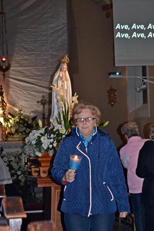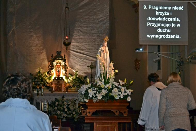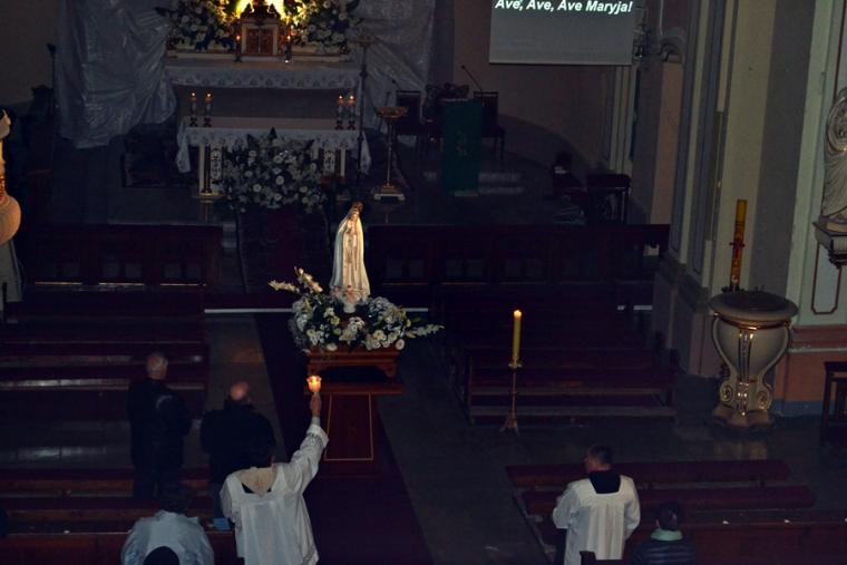 Kolejne postanowienia dotyczyły codziennej modlitwy do Ducha Świętego, a także obrania Maryi za Królową naszych serc. Podczas odmawiania piątej tajemnicy w świątyni zapłonęły lampiony przyniesione przez wiernych. Zostały one zapalone od świecy jubileuszowej stojącej przy figurze Fatimskiej Pani. Następnie odmówiliśmy modlitwę Anioła i ze śpiewem na ustach z zapalonymi lampionami wyruszyliśmy figurą Fatimskiej Pani z procesją wokoło kościoła. W tym czasie rozległ się dźwięk dzwonów, który przypomina nam o tym, by stanąć do Apelu Jasnogórskiego. Towarzyszy nam on od czasu nawiedzenia naszej parafii przez Czarną Madonnę w 2011 roku. Po powrocie do kościoła został odśpiewany Apel Jasnogórski . Maryjo: jesteśmy, pamiętamy, czuwamy- to wyznanie popłynęło ku niebu z naszego parafialnego wieczernika. Modlitwą w ten wieczór objęliśmy także zgromadzonych w polskiej Fatimie na zakopiańskich Krzeptówkach Kustoszy Sanktuariów i uczestników Międzynarodowego Kongresu Maryjno- Mariologicznego.