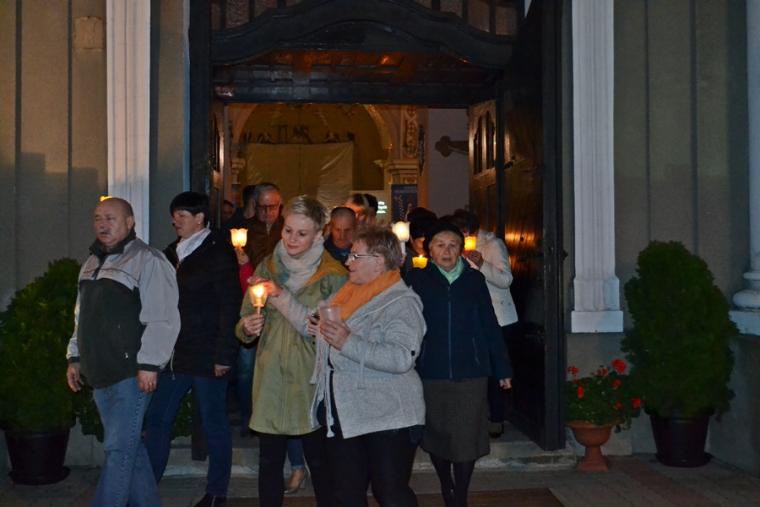 Po zakończeniu modlitwy różańcowej za krzyżem i figurą Matki Boże Fatimskiej ze śpiewem na ustach, z płonącymi lampionami wyruszyliśmy w procesji wokół kościoła. Po powrocie procesji do kościoła w łączności duchowej z Jasną Górą zaśpiewaliśmy Apel Jasnogórski. Ku niebu popłynęły słowa: Maryjo: jestem, pamiętam, czuwam.
