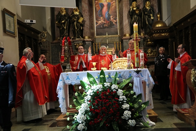 Wraz z biskupem kaliskim Edwardem Janiakiem modlili się: ks. prał. Jacek Plota, kustosz Narodowego Sanktuarium św. Józefa, ks. kan. Paweł Jabłoński, kapelan strażaków powiatu kaliskiego, ks. kan. Piotr Kuświk, kapelan strażaków powiatu ostrowskiego i ks. kan. Krzysztof Duchnowski, kapelan biskupa.