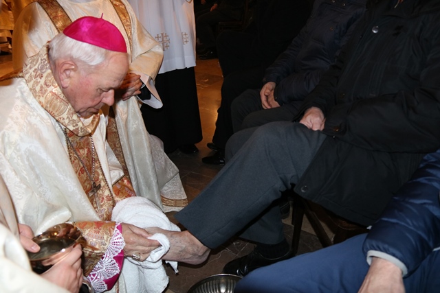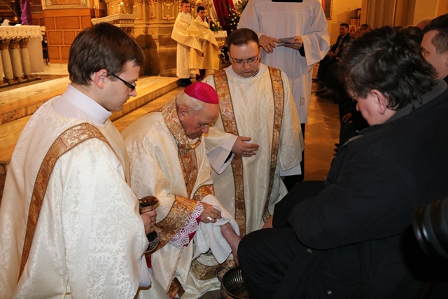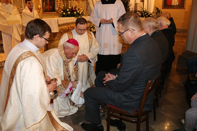 Podczas liturgii Wielkiego Czwartku bp Stanisław Napierała obmył nogi dwunastu mężczyznom – przedstawicielom parafian katedry św. Mikołaja w Kaliszu.
