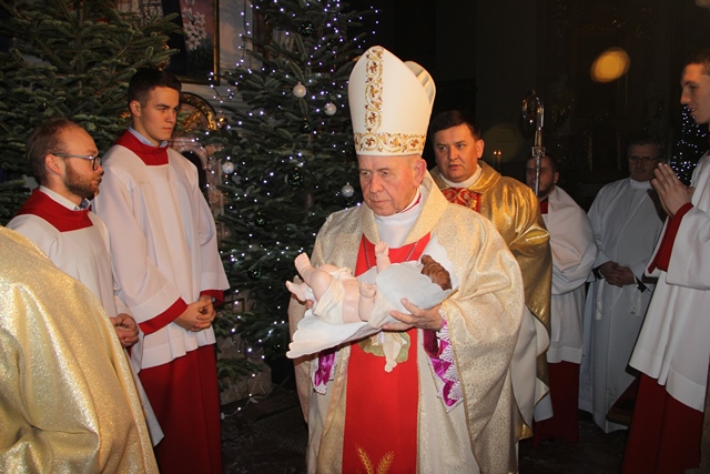 Przed rozpoczęciem Eucharystii w procesji bp Stanisław Napierała zaniósł figurkę Dzieciątka do żłóbka.