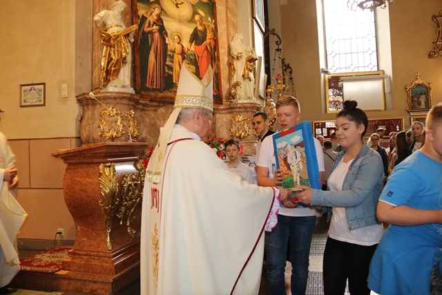 Biskup wręczył dyplomy i upominki laureatom konkursu plastycznego pt. „Św. Józef patron rodziny”. Uczniowie 9 szkół specjalnych z terenu diecezji kaliskiej wykonali obrazy przedstawiające św. Józefa.