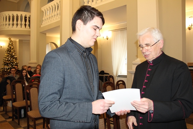 Laureaci odebrali dyplomy i nagrody z rąk ks. prałata Jerzego Adamczaka, wikariusza biskupiego ds. katechizacji. Książki i dyplomy przygotowano dla wszystkich uczestników. Fundatorami nagród byli: Biskup Kaliski Edward Janiak, Wydawnictwo św. Wojciecha w Poznaniu, Wydawnictwo Jedność w Kielcach, Wydawnictwo Gaudium w Lublinie i Wydział Katechetyczny Kurii Diecezjalnej w Kaliszu. - Wiedza chociaż jest bardzo ważna także dla uzasadnienia swoich postaw religijnych nie wystarczy, bo trzeba być człowiekiem wierzącym, a wiarę uzyskuje się poprzez kontakt z Panem Jezusem. Chcąc być rzeczywiście człowiekiem religijnym trzeba mieć wiedzę, ale przede wszystkim trzeba nauczyć się być w kontakcie z Bogiem i tego Wam wszystkim życzę – mówił ks. prałat Jerzy Adamczak.