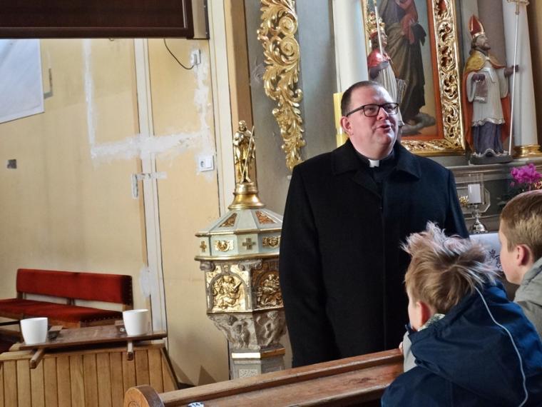 Następnie uczestnicy konkursu wraz z opiekunami udali się do sanktuarium Matki Bożej Pocieszenia. Tu jego kustosz, ks. kanonik Łukasz Żurawski zapoznał wyjątkowych pielgrzymów z historią sanktuarium oraz opowiedział o obrazach i figurach świętych, znajdują się w ołtarzu głównym i ołtarzach bocznych świątyni. Ksiądz kustosz wręczył nagrodę specjalną Aleksandrze Frala- obraz Matki Bożej Pocieszenia. Aleksandra zdobyła największą ilości punktów w części konkursowej dotyczącej Sanktuarium Matki Bożej Pocieszenia w Lutogniewie. Zorganizowany konkurs to ciekawa inicjatywa, która zmotywowała uczestników do pogłębienia wiedzy o miejscowym sanktuarium, a także o sanktuarium w Gietrzwałdzie w 140. rocznicę objawień. Organizatorem konkursu była katechetka Agata Hadryś.