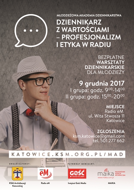 W zgłoszeniu należy podać imię, nazwisko, wiek oraz grupę, w której chce się uczestniczyć. Zapisy: ksm.katowice@gmail.com lub 501277662. Organizatorami II edycji Młodzieżowej Akademii Dziennikarstwa są KSM Archidiecezji Katowickiej oraz Radio eM.