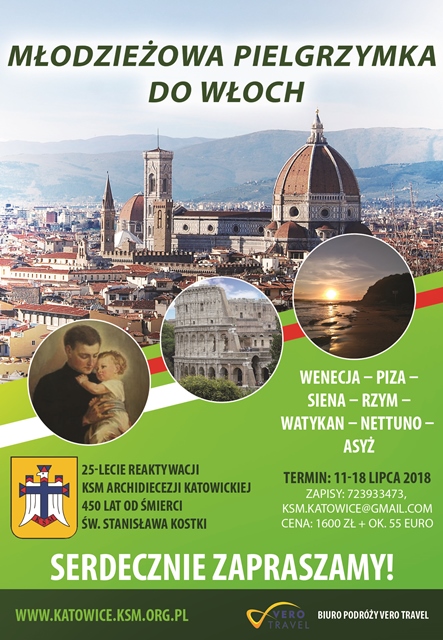 Wenecja, Piza, Siena, Rzym, Watykan z modlitwą Anioł Pański z papieżem Franciszkiem, Asyż, Nettuno, wypoczynek nad Morzem Tyrreńskim - brzmi dobrze? Pojedź z nami na młodzieżową pielgrzymkę do Włoch! - w taki sposób do wspólnego pielgrzymowania zaprasza Katolickie Stowarzyszenie Młodzieży Archidiecezji Katowickiej.