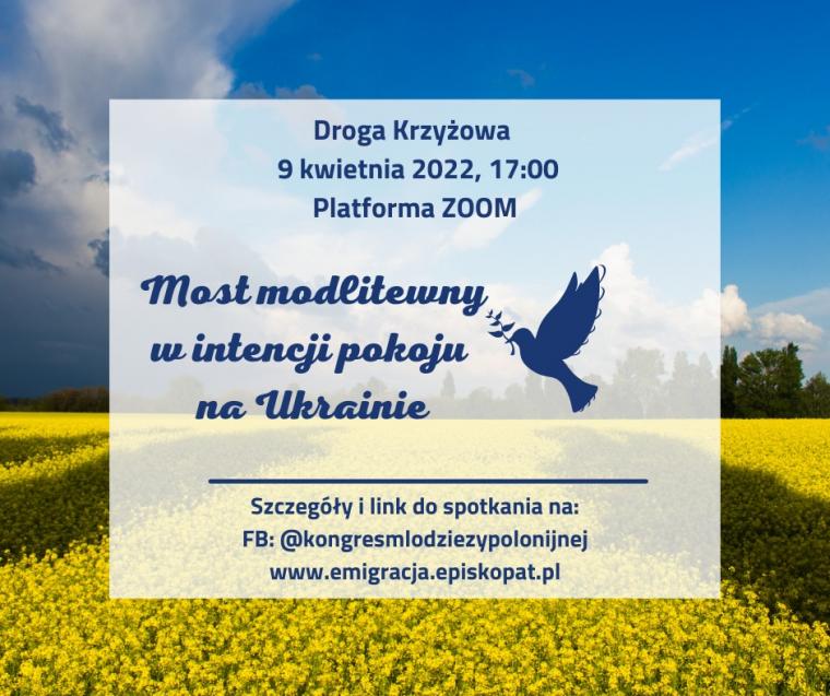 Podczas Kongresu będziemy także modlić o pokój na Ukrainie. Drogę Krzyżową o godz. 17.00 poprowadzi młodzież z Ukrainy. Zapraszamy Was, a także Waszych przyjaciół i znajomych, stwórzmy most modlitewny w intencji pokoju na Ukrainie. Jeśli nie możesz uczestniczyć w całym spotkaniu Kongresu Młodzieży Polonijnej - Bądź z nami na modlitwie!