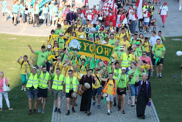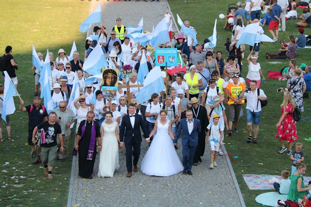 Jako pierwsza na Jasną Górę weszła grupa różowo-niebieska z Narodowego Sanktuarium św. Józefa w Kaliszu, której przedstawiciele nieśli obraz św. Józefa Kaliskiego. Na czele szli: bp Łukasz Buzun i ks. prał. Jacek Plota, kustosz kaliskiej bazyliki. – Aspekt Nadzwyczajnego Roku Świętego Józefa Kaliskiego podkreśliło wejście na Jasną Górę z obrazem św. Józefa, który na początku istnienia diecezji kaliskiej peregrynował po wszystkich parafiach i teraz umieszczony jest w kaplicy seminaryjnej. Było to symboliczne przejście św. Józefa do Maryi, czyli z Narodowego Sanktuarium św. Józefa do Narodowego Sanktuarium Matki Bożej – zaznacza ks. Rafał Grzęda.