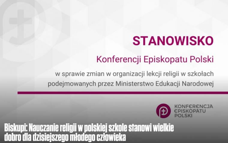 Biskupi zwrócili uwagę, że lekcja religii w szkołach publicznych obecna jest w 23 krajach Europy i jest traktowana jako standard systemów edukacyjnych. „Wyrażamy sprzeciw wobec ostatnich decyzji Ministerstwa Edukacji Narodowej odnoszących się do organizacji lekcji religii w szkole. Apelujemy o uwzględnienie woli rodziców, którzy w zdecydowanej większości posyłają swoje dzieci i młodzież na lekcje religii. W skali całego naszego kraju jest to prawie osiemdziesiąt procent rodziców. Oni mają prawo do lekcji religii na terenie szkoły publicznej, gdyż wynika to z podstawowych praw i wolności człowieka, zagwarantowanych w Konstytucji Rzeczypospolitej Polskiej i Konkordacie między Stolicą Apostolską i Rzecząpospolitą Polską” – czytamy w Stanowisku.