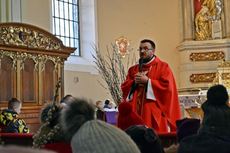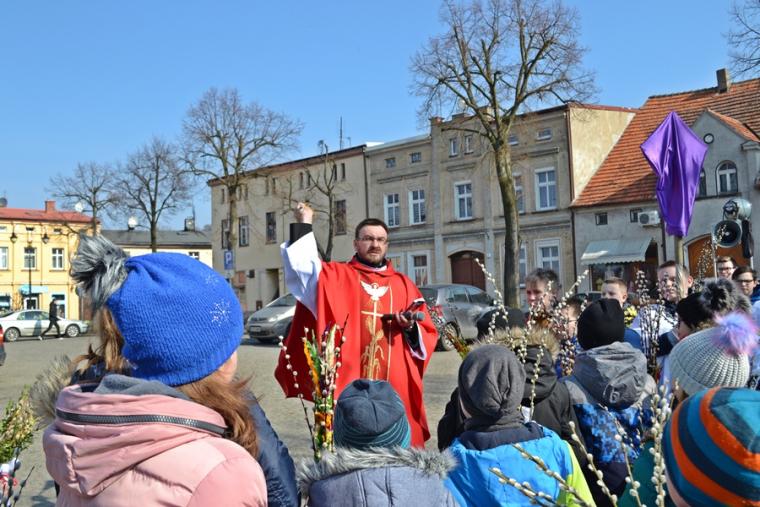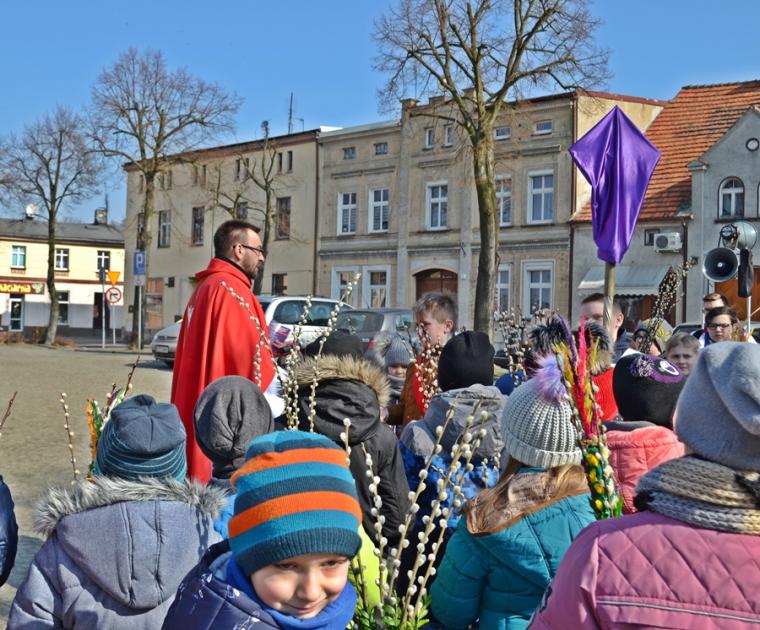Młodsi zebrali się o godz. 10:50 przy figurze Serca Jezusowego na Rynku. Tu ks. wikariusz Krzysztof odczytał fragment Ewangelii opisujący wjazd Jezusa do Jerozolimy, następnie odmówił modlitwę i pobłogosławił przyniesione przez wiernych, głównie dzieci palmy. Po pobłogosławieniu palm zebrani na rynku udali się procesjonalnie do kościoła, gdzie ks. wikariusz Krzysztof Lipiński wraz z ks. kan. Grzegorzem Klapą sprawowali Eucharystię. W słowie skierowanym do zebranych w mikstackim wieczerniku ks. wikariusz podkreślił znaczenia dla wierzących nadchodzących dni Triduum Paschalnego. Zachęcał do uczestnictwa w nim zarówno dorosłych, jak i dzieci. W słowach skierowanych do rodziców zwrócił uwagę, że to na nich spoczywa obowiązek wyjaśnienia dzieciom znaczenia Triduum Paschalnego. Podkreślił, że najlepiej można to uczynić biorąc wspólnie w nim udział. Trudno jest wyjaśnić, opowiedzieć – jak powiedział jego istotę.