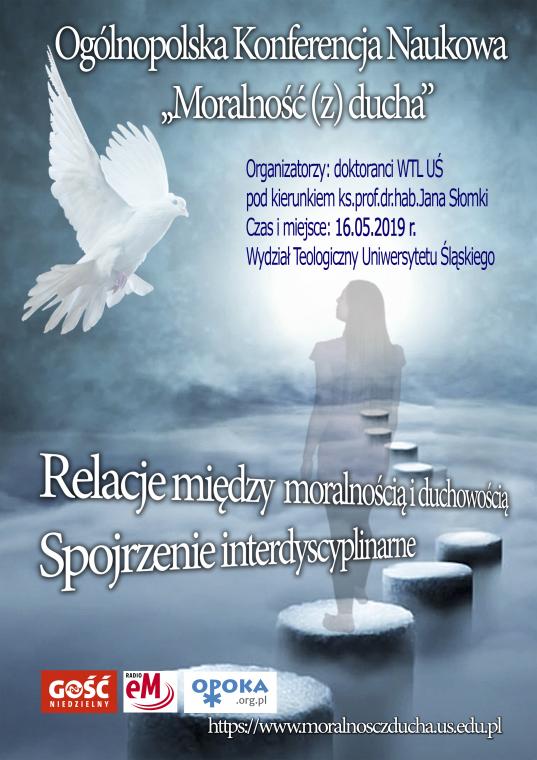 Doktoranci Wydziału Teologicznego Uniwersytetu Śląskiego pod kierunkiem ks. prof. dr. hab. Jana Słomki mają zaszczyt zaprosić na Ogólnopolską Konferencję Naukową „Moralność (z) ducha”. Jest ona próbą interdyscyplinarnego spojrzenia na relacje między duchowością a moralnością.