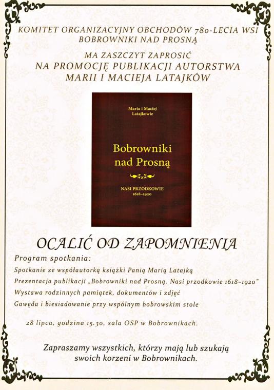 28 lipca, w sobotę o godz. 15:30 w Sali Ochotniczej Straży Pożarnej w Bobrownikach nad Prosną ( woj. Wielkopolskie odbędzie się spotkanie „ Ocalić od zapomnienia”. To cenna inicjatywa, gdy człowiekowi brakuje czasu na refleksję, na poszukiwanie „ swoich korzeni”. Podczas spotkania odbędzie się promocja książki pt. „Bobrowniki nad Prosną. Nasi przodkowie 1618–1920” autorstwa Państwa Marii i Macieja Latajków.