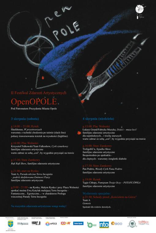 OpenOpole to festiwal, który próbuje złapać uwagę (i serce) Widzów/Uczestników – tych podróżujących od Zdarzenia do Zdarzenia w rytmie dwóch dni atrakcji, jak i tych zatrzymanych przypadkiem, w pół biegu… zatrzymanych w miejscach niezwykłych, miejscach szczególnych, miejscach opolskich…
