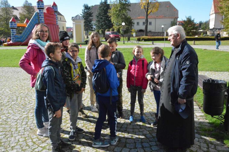 Kolejnym punktem spotkania była gra terenowa, w której uczestniczyła większość małych pielgrzymów. Z pomocą specjalnie przygotowanej książeczki-przewodnika po sanktuarium dzieci miały do wykonania konkretne zadania, dzięki którym poznawały także tajniki zabytków krzeszowskiego opactwa.