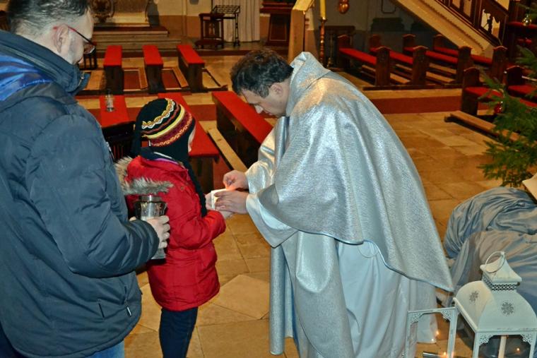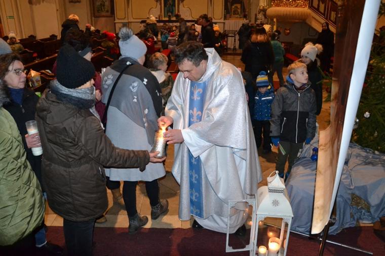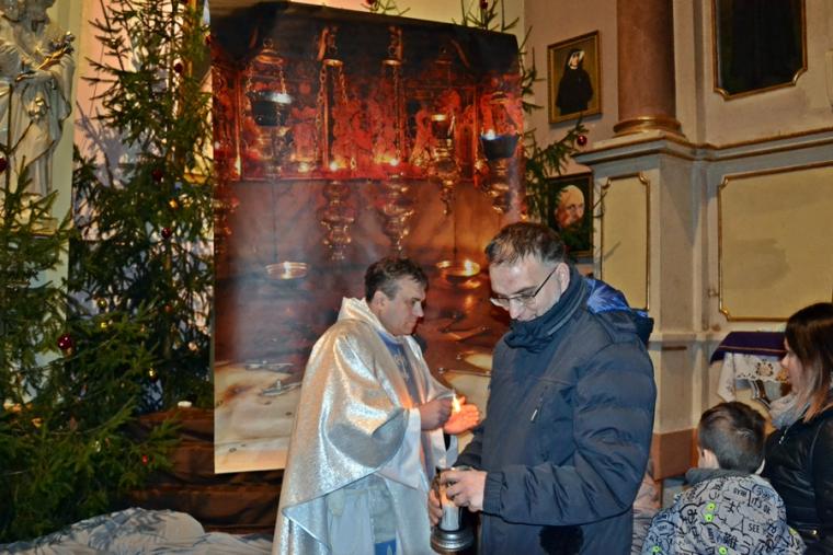 Po zakończeniu mszy świętej, przy banerze przedstawiającym Grotę Narodzenia Pana Jezusa ks. proboszcz zapalał świece, lampki przyniesione przez wiernych. Wiele osób zabrało do swoich domów Betlejemskie Światło Pokoju. Stojące przy ołtarzu w kościele i zaniesione do naszych domów Betlejemskie Światło Pokoju przypomina nam, że Pan jest już blisko, naprawdę blisko. Mobilizuje nas ono do czuwania i oczekiwania wraz z Maryją Józefem na przyjście Pana.