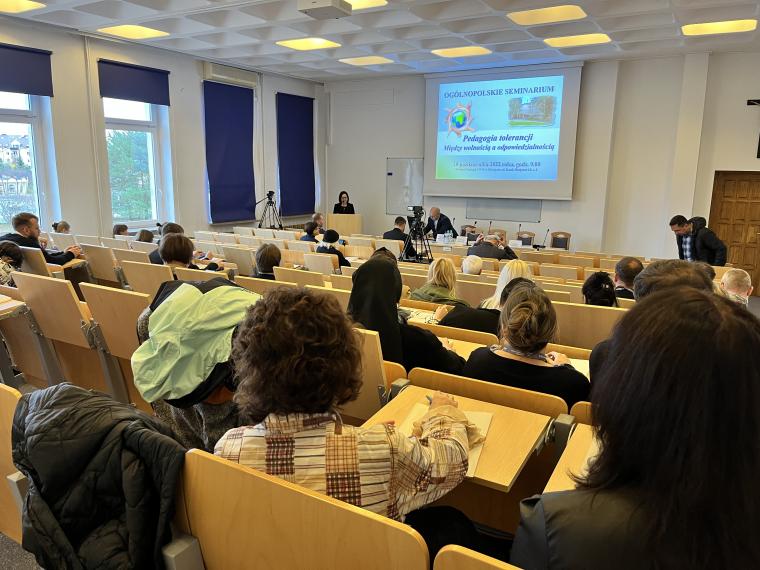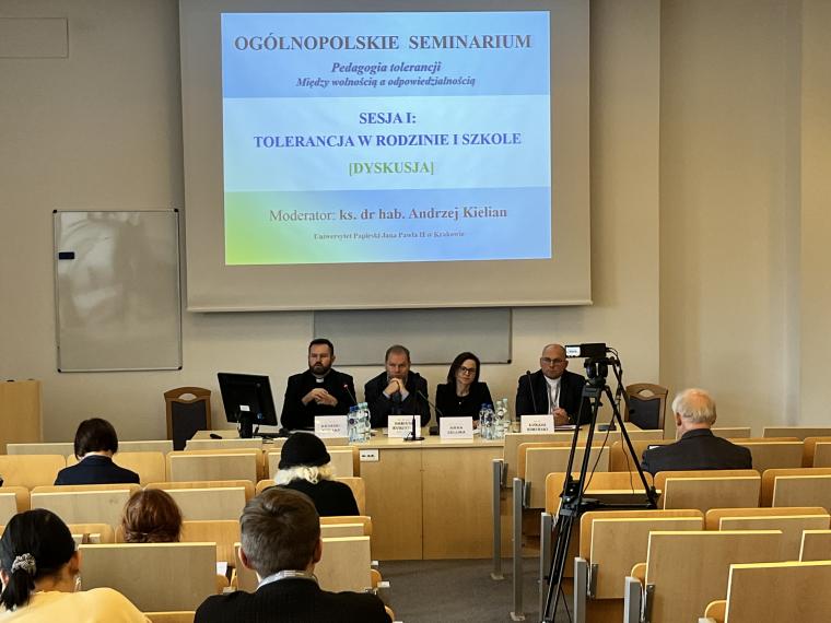 Zostało ono zorganizowane przez Katedrę Teologii Pastoralnej i Katechetyki we współpracy z Uniwersytetem Opolskim i Uniwersytetem Marii Curie-Skłodowskiej w Lublinie. Seminarium odbyło się w ramach projektu „Pedagogia tolerancji. Podążając za Karolem Wojtyłą”, realizowanego przy wsparciu Ministra Edukacji i Nauki w programie Społeczna Odpowiedzialność Nauki (nr projektu SONP/SP/461712/2020). Kierownikiem projektu jest ks. prof. dr hab. Zygfryd Glaeser z Wydziału Teologicznego Uniwersytetu Opolskiego, a wykonawcami w tym projekcie są: prof. dr hab. Anna Zellma z Wydziału Teologii UWM w Olsztynie i prof. dr hab. Jan Pomorski z Uniwersytetu Marii Curie-Skłodowskiej w Lublinie. Patronat honorowy objęli: Warmińsko-Mazurski Kurator Oświaty w Olsztynie, Komisja Wychowania Katolickiego Konferencji Episkopatu Polski i Stowarzyszenie Katechetyków Polskich. W seminarium udział wzięli liczni przedstawiciele grona pedagogicznego i środowiska akademickiego z całej Polski, w tym dyrektorzy szkół, nauczyciele, pedagodzy, katecheci, psycholodzy szkolni, dyrektorzy wydziałów katechetycznych, przedstawiciele mediów. Główną osią dyskusji była pedagogia tolerancji inspirowana nauczaniem Jana Pawła II, w której istotne miejsce zajmuje fundament aksjologiczny. W ramach seminarium poszukiwano odpowiedzi na pytania: czym jest właściwie rozumiana postawa tolerancji i jak ją praktykować na co dzień? Podjęto dialog z przedstawicielami różnych środowisk naukowych i wychowawczych (rodziny, szkoły, Kościoła, mediów) w celu wymiany doświadczeń w zakresie towarzyszenia młodym w kształtowaniu postawy tolerancji. Prelegenci i uczestnicy wspólnie debatowali nad tym, jakie są współczesne wyzwania w zakresie wychowania do tolerancji pozytywnej oraz co zrobić, aby wspólnie działać na rzecz promocji tolerancji inspirowanej nauczaniem Jana Pawła II. W pierwszym dniu odbyły się dwie sesje tematyczne. Pierwszą sesję moderował ks. dr hab. Andrzej Kielian (UPJPII). Tematyka koncentrowała się wokół tolerancji w rodzinie i szkole. Ks. dr hab. Dariusz Kurzydło, prof. UKSW interesująco przedstawił znaczenie rodziny w wychowaniu do tolerancji. Przypomniał, że rodzina jest pierwszą i znaczącą szkołą tolerancji. Szacunek do drugiego człowieka i do własnych korzeni, aktywne słuchanie siebie nawzajem, dzielenie się odpowiedzialnością, współdziałanie, akceptacja starości i przyjęcie nienarodzonego życia odgrywają ważną rolę w kształtowaniu postawy tolerancji pozytywnej w rodzinie. Przyczyniają się do budowania „nowej kultury życia” (EV 22). Ks. dr Łukasz Simiński (UMK, WSD w Pelplinie) wygłosił referat pt. Tolerancja w środowisku szkolnym a wykluczenie z powodów religijnych. Współczesna szkoła – jak trafnie zauważył – stawia wychowawców i wychowanków nie tylko wobec wyzwań w zakresie tolerancji religijnej, ale wobec szeroko rozumianego wykluczenia z powodów religijnych zarówno w gronie nauczycieli, jaki i uczniów. Rozważania teoretyczne ks. dr Ł. Simiński wzbogacił o interesujące odwołanie do wyników badań empirycznych, zarówno ilościowych, jak i jakościowych, w tym do studium przypadków. Wskazał na potrzebę otwartości na wychowanków, wczuwania się w ich środowisko, bycia z nimi, słuchania ich, prowadzenia dialogu, budowania relacji opartych na prawdzie i miłości oraz uczenia wrażliwości na odmienność drugiego człowieka. Do tematyki referatów bezpośrednio nawiązano w dyskusji, zwracając uwagę na nowe wyzwania w zakresie kształtowania postawy tolerancji pozytywnej. Krzysztof Marek Nowacki, Warmińsko-Mazurski Kurator Oświaty w Olsztynie, zabierając głos w dyskusji przypomniał, że „życie rodziców to jest książka podstawowa, którą czyta dziecko” (św. Augustyn). Wskazał na potrzebę pedagogizacji rodziców. Przypomniał o potrzebie oparcia tolerancji na fundamencie chrześcijańskich wartości i wyraźnego sprzeciwu wobec permisywizmu i polaryzacji społecznej. Zaznaczył też, że w kształtowaniu postawy tolerancji pozytywnej ważną rolę odgrywa samo spotkanie z drugim człowiekiem na różnych poziomach istnienia, szacunek drugiego człowieka i jego godności, otwartość, roztropność, wrażliwość społeczna, miłości do Boga, drugiego człowieka i ojczyzny. Uczestnicy dyskusji, reprezentujący różne środowiska wychowawcze i naukowe, dzielili się też osobistym doświadczeniem, zwracając uwagę na brak pogłębionej refleksji nad znaczeniem słowa „tolerancja”, utopijną wizję miłości i szacunku wobec każdego człowieka, każdego jego zachowania, postawy, poglądów i przekonań. Za kluczowe uznali stwarzanie dzieciom i młodzieży możliwości w zakresie prowadzenia dialogu, umiejętność empatycznego słuchania oraz okazywania wzajemnego szacunku i obdarowania się dobrem. Współczesny wychowawca ma być człowiekiem otwartym, odpowiedzialnym, zdolnym do obrony wartości i sprzeciwu wobec zła.