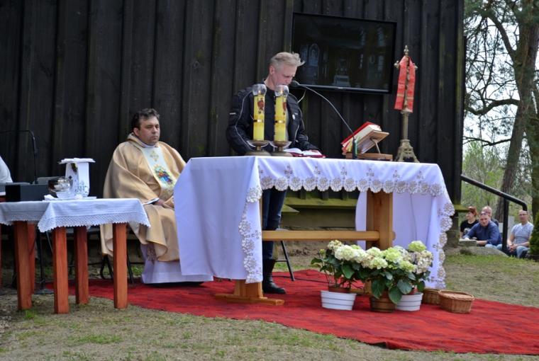 O godz. 14:00  ks. kan. Krzysztof Ordziniak sprawował przy ołtarzu polowym przed sanktuarium Mszę Świętą w ich intencji. Modlił się o Boże błogosławieństwo, pomyślność na drogach i bezpieczeństwo dla wszystkich podróżujących. Oczywiście modlitwą zostali objęci wszyscy, zarówno właściciele małych rowerków, jak i wielkich ciężkich motorów. Wszyscy oni tworzą jedną wielką wspólnotę. W słowie skierowanym do zebranych ks. kanonik nawiązał do naklejki, na której jest Anioł  Stróż i napis "Jedź tak, aby Twój Anioł Stróż zdążył za Tobą”. Kontynuując kaznodzieja zwrócił uwagę, że na obrazie przedstawiającym Patrona Sanktuarium, ale i pielgrzymów, jest także anioł. Towarzyszył mu on w ziemskiej wędrówce. Ksiądz kustosz zaakcentował, że zapewne każdy pamięta modlitwę, której nauczyli nas w dzieciństwie rodzice „Aniele Boży, stróżu mój…”. Zwrócił uwagę, że każdy człowiek ma Anioła Stróża, który  strzeże go, czuwa nad nim, dopomaga. Warto jednak pamiętać, by poruszać się w swoim życiu tak, by nasz anioł za nami zdążył.