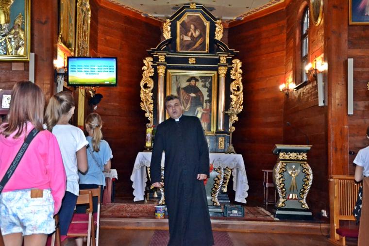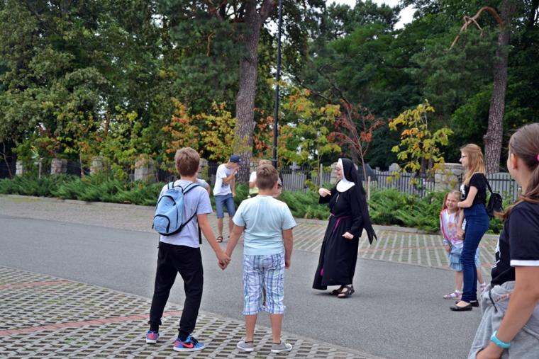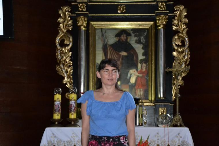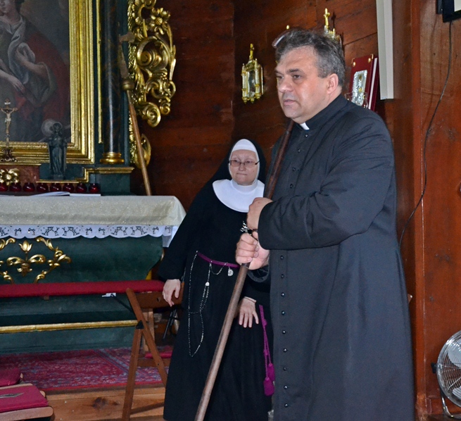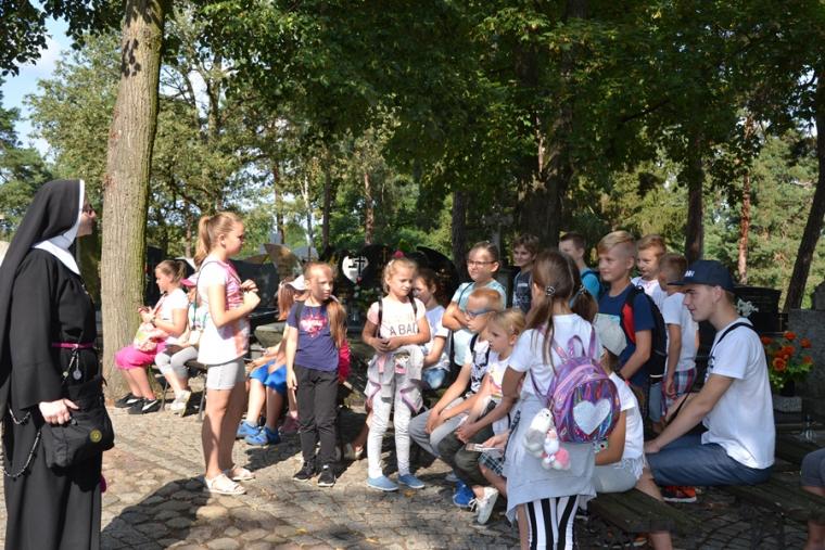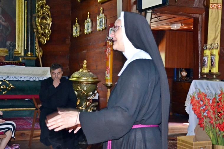 Jak okazało się w drugim dniu spotkań, dzieci sumiennie wykonały pracę domową. Było jeszcze jedno zadanie, gdyż w trakcie tegorocznej Szkoły pojawił się kufer dziedzictwa. Podczas poszczególnych dni dzieci będą wkładały do niego rysunki, fotografie, opisy, tego co składa się na nasze dziedzictwo kulturowe. Na początek dzieci miały przyjrzeć się dziedzictwu należącemu do nich. Kufer w czwartkowe przedpołudnie zaczął się wypełniać. W tym drugim dniu w Rochowej Szkole był oczywiście czas na modlitwę nowennową podczas której ks. kan. Krzysztof odczytywał przyniesione przez młodych intencje. Potem dzieci uczciły relikwie św. Rocha. Po modlitwie przyszedł czas na wspólny śpiew. W jego prowadzeniu niezastąpiona okazała się s. Małgorzata, która pewnie już do końca spotkań w Rochowej Szkole będzie dbała o to, by rozśpiewać dzieci, a także organizować dla nich zabawy ruchowe.Ta wakacyjna szkoła została zorganizowana m.in. po to, by dzieci poznały życie św. Rocha, a także wartości, którymi kierował się On w swoim życiu. W tym celu ksiądz kustosz wykorzystał fragment programu „Ziarno” poświęconego św. Rochowi. Dodajmy, że fragmenty tego programu były realizowane na terenie naszej parafii. Uczestniczyli w nim młodzi Mikstaczanie. W drugim dniu omówione zostały atrybuty, z którymi na obrazach i rzeźbach przedstawiany jest św. Roch. Stało się to impulsem do wskazania podobieństw i różnic w ikonograficznych przedstawieniach św. Rocha i św. Jakuba. Podczas spotkania dzieci obejrzały film animowany „N- jak niewidomy”, w którym mogły zobaczyć w jaki sposób można pomagać osobom niewidomym bądź niedowidzącym. Ksiądz kustosz omawiając strój św. Rocha zwrócił uwagę na laskę pielgrzymią. Z filmu dzieci dowiedziały się, że biała laska może być bardzo pomocna dla osoby niewidomej. Nie zabrakło także opowieści o psach przewodnikach osób niewidomych. Film był forma przygotowania do spotkania z gościem, który tego dnia odwiedził uczestników Szkoły Świętego Rocha. Mamy nadzieję, że spotkanie to na długo pozostanie w ich pamięci. Kim był ten niezwykły gość? Otóż na spotkanie z młodymi przybyła Pani Gabriela Przygoda. Pani Gabriela jest osobą niewidomą, straciła wzrok mając 20 lat. Podczas spotkania Pani Gabrysia przedstawiła się w kilku zdaniach, a następnie bardzo chętnie odpowiadała na pytania młodych, trzeba przyznać, że było ich bardzo wiele. Młodzi pytali m.in. o to jak radzi ona sobie z czynnościami dnia codziennego takimi jak sprzątanie, gotowanie, prasowanie, mycie, poruszanie się po mieszkaniu, dobieranie kolorystyki ubrania, pakowanie walizki na wyjazd. Pani Gabrysia podkreślała, że pomocne są tu często zdobycze techniki. Podkreśliła, że osoby niewidome mają z reguły bardzo uporządkowane życie. Troska o ład ułatwia im funkcjonowanie, gdyż wiedzą wtedy gdzie mogą znaleźć konkretne przedmioty. Jest jeszcze jedna rzecz, którą należy powiedzieć o gości. Pani Gabriela została obdarowana przez Pana Boga pięknym głosem. Dane nam było posłuchać w sanktuarium pieśni Ave Maria Jasnogórska Pani. Może kiedyś uda się Pani Gabrysi wydać płytę, życzymy jej tego z całego serca. Po licznych pytaniach zadanych przez młodych ksiądz kan. Krzysztof zapytał Panią Gabrysię co chciałaby powiedzieć młodym ludziom. Zacytujmy to przesłanie: „Żeby żyli każdym dniem, żyli tak, żeby nikt przez nich nie płakał, bo jeżeli jest się młodym nie zwraca się uwagi na to co się robi, krzywdzi się ludzi, to to wszystko potem wraca, jeżeli się ich nie krzywdzi, a stanie się nam krzywda to ma się pomoc z każdej strony, ale jeśli się tego nie zauważa i tego nie robi to wtedy jest naprawdę ciężko”.
