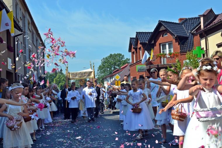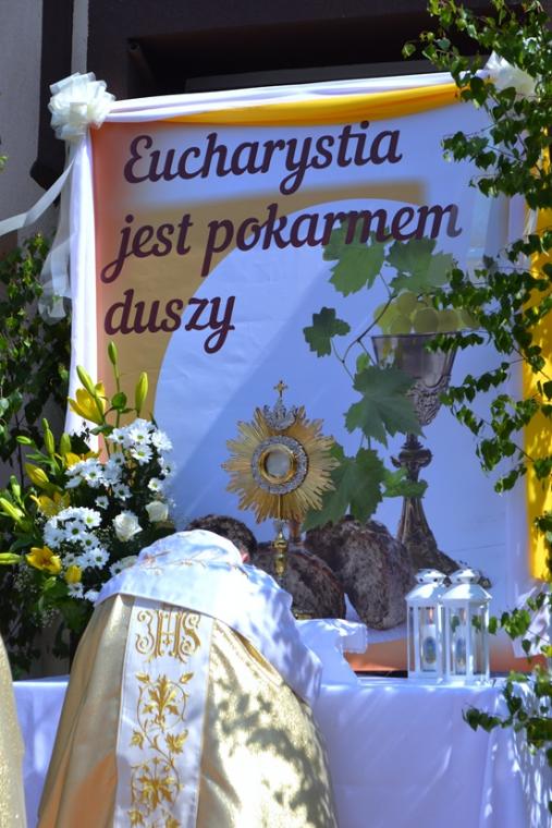 Wracając do głównego wątku rozważania kaznodzieja zachęcał wiernych do postawienia sobie pytania: „Co Jezus ukryty pod postacią Chleba, zobaczy w czasie wędrowania przez nasze miasto i parafię? Jaką zobaczy Ojczyznę, jaki Kościół, jaką rodzinę, jakiego człowieka?”. W dalszej części homilii celebrans podkreślił, że uroczystość Bożego Ciała jest wielkim pokłonem złożonym Jezusowi, ale jednocześnie zachęcał, by odpowiedzieć sobie na pytanie, czy zawsze oddajemy Bogu pokłon. Zaznaczył, że różnie z tym bywa. Myślą przewodnią rozważania były słowa pieśni „ Zróbcie Mu miejsce…”. Kończąc rozważanie ks. kanonik powiedział: „ Mam do Was ogromną prośbę w tym roku, abyśmy zrobili Bogu miejsce w naszych kalendarzach, które są tak mocno zapełnione różnymi sprawami”. Parafia podzielona jest na rejony, jak podkreślił ks. proboszcz nie tylko po to, by wywiązywały się one m.in. z organizacji procesji w poszczególnych dniach, ale i po to, by ich mieszkańcy w tych dniach uczestniczyli w Eucharystii. Jak odpowiemy na to zaproszenie? Czy zrobimy miejsce dla Pana w naszych sercach i w naszych kalendarzach. Tak wielu z nas przyjęło Jezusa w Komunii Świętej. Zrobiliśmy Mu miejsce w naszych sercach. Po Mszy Świętej odbyło się wystawienie Najświętszego Sakramentu, następnie wraz z Jezusem ukrytym pod postacią Chleba wyruszyliśmy w procesji do czterech ołtarzy. Przedstawiciele poszczególnych regionów przygotowali ołtarze. Trasa tegorocznej procesji wiodła od Diecezjalnego Sanktuarium Świętego Rocha do krzyża misyjnego przy naszej farze, której 100- lecie konsekracji przeżywać będziemy w październiku. Jak to już staje się tradycją w naszej wspólnocie co roku procesja odbywa się inna trasą, bo Jezus przychodzi do wszystkich. Przy poszczególnych ołtarzach wsłuchiwaliśmy się w rozważania, których myślą przewodnia była EUCHARYSTIA. Na pierwszym ołtarzu znajdowało się hasło: Eucharystia jest Ofiarą. W słowach rozważania usłyszeliśmy m.in. „ W opisie Eucharystii bardzo ważne są cztery czasowniki: brać, błogosławić, łamać, dawać. Dzięki nim możemy zaobserwować, na czym polega logika ofiary Jezusa”. O tym jak wielka jest tajemnica Boga i o Eucharystii jako pokarmie dla duszy mowa była w rozważaniu przy drugim ołtarzu. Na trzecim ołtarzu widniało hasło: „Eucharystia jest sakramentem zjednoczenia”. Tu do wiernych popłynęło przesłanie: „ Ten, który pokonał śmierć może wejść pomimo drzwi zamkniętych, pomimo zakrytych bielmem oczu i zatwardziałych serc. Wówczas, gdy On wychodzi nam naprzeciw , ukazuje się jako żyjący, dający życie”. Hasło na trzecim ołtarzu zachęcało nas do spojrzenia na Eucharystię jako zadatek nieśmiertelności. Tu wybrzmiało także Te Deum laudamus. Procesję zakończyło błogosławieństwo Najświętszym Sakramentem na cztery strony świata. Podczas procesji niesione były sztandary i feretrony. Uroczystość uświetniła orkiestr parafialna i chór. A tuż przed baldachimem kroczyły dziewczęta sypiące kwiatki. Było ich podczas tegorocznej procesji bardzo dużo. Jezus ukryty pod postacią Chleba przemierzał ulice naszego miasteczka obsypywany płatkami kwiatków.