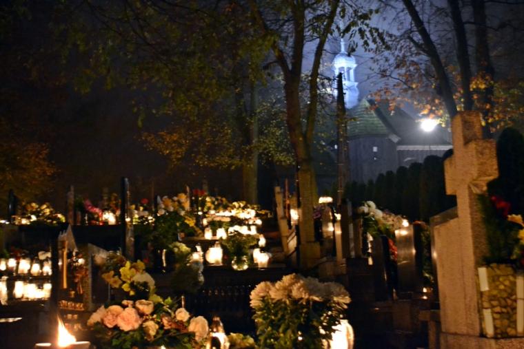 Głęboka w treści i zachęcająca do refleksji, ale i przemiany życia była ta przytoczona w rozważaniu legenda. Czy potrafimy odwiedzić, pocieszyć, dodać otuchy, być przy człowieku pogrążonym w smutku, płaczącym, biednym, głodnym, pragnącym sprawiedliwości. Czy potrafimy zdobyć się na zwykły ludzki gest? Być może to właśnie od tych zwykłych, pozornie nic nie znaczących gestów świadczących o miłości wobec bliźnich będzie zależało co usłyszymy od Boga, gdy przyjdzie nam zdać sprawę z naszego życia. Pan ofiarował nam czas, ale także przykład życia tak wielu świętych. Oni mogli osiągnąć świętość, możemy i my. Czy osiągniemy? Po Mszy Świętej alejkami wokół Sanktuarium wyruszyła procesja, podczas której przy pięciu stacjach modliliśmy się za zmarłych: kapłanów, biskupów, papieży, za rodziców, rodzeństwo, dziadków, krewnych, przyjaciół. Przy trzeciej stacji modlitwą objęliśmy zmarłych parafian, sąsiadów. Nie zabrakło także modlitwy w intencji tych, których miejsca wiecznego spoczynku nie znamy, a także za tych którzy zginęli obozach koncentracyjnych. Przy piątej stacji modliliśmy się za wszystkich zgromadzonych na cmentarzu prosząc dla nich o pragnienie osiągnięcia świętości. Modlitwą objęta została także ta osoba, którą jako pierwszą spośród zebranych Pan powoła do siebie. Nie wiemy kto to będzie, to wie tylko Bóg. Niewątpliwie modlitwa przy tej stacji stanowiła okazję do tego, by zadać sobie pytanie- czy jestem przygotowany ( przygotowana) na spotkanie z Panem. Uroczystość uświetniła orkiestra parafialna. O godz. 19:00 w sanktuarium spotkaliśmy się na modlitwie różańcowej połączonej z wypominkami. Mimo padającego deszczu jeszcze w późnych godzinach wieczornych wielu przemierzało cmentarne alejki, zatrzymując się przy grobach bliskich, przyjaciół, znajomych. Ofiarowana modlitwa, położone na grobach kwiaty, płonące lampki są dowodem na to, że o nich pamiętamy…