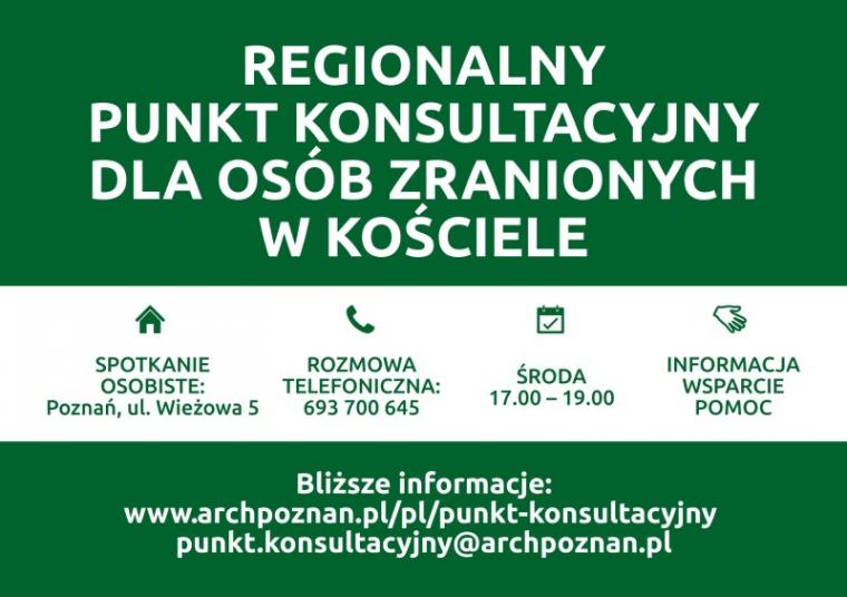 Punkt konsultacyjny powstał z myślą o osobach pełnoletnich z regionu zachodniej i północnozachodniej Polski jako miejsce wsparcia dla osób pokrzywdzonych. Mogą one skorzystać z bezpośredniego kontaktu z odpowiednio przeszkolonymi konsultantami lub skontaktować się telefonicznie (nr tel. 693 700 645) bądź za pośrednictwem poczty elektronicznej (e-mail: punkt.konsultacyjny@archpoznan.pl).