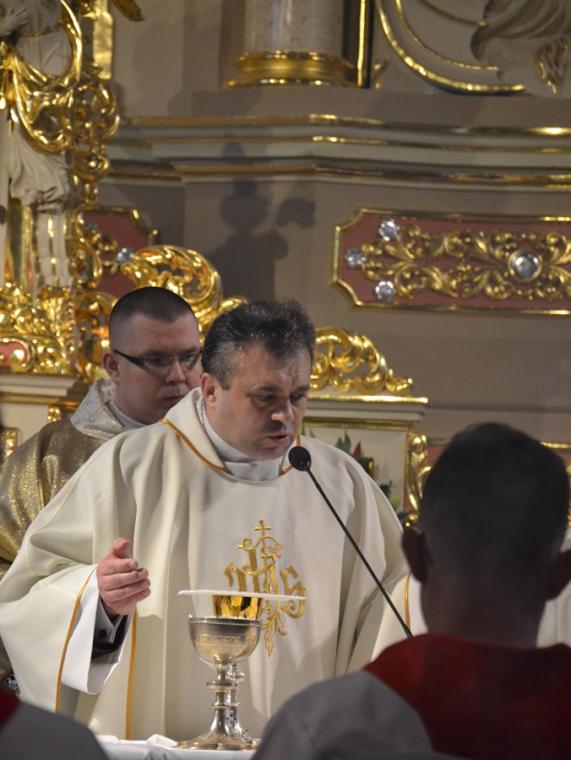 Homilię podczas Mszy Wieczerzy Pańskiej wygłosił ks. Marcin, który na początku ukazał jak wyglądały przygotowanie do tradycyjnej paschy żydowskiej. Zwrócił uwagę na szczególna troskę o baranka, którego następnie zabijano, bo potrzebna była krew do dopełnienia obrzędu paschy. Nawiązując do Ewangelii zwrócił uwagę, że Jezus spożył wieczerzą z uczniami przed paschą. Podkreślił, że Jezus swoją paschę odbędzie w Wielki Piątek. Kontynuując kaznodzieja zapytał: „ Czym zatem jest to co Jezus uczynił uczniom podczas wieczerzy”? Odpowiadając nawiązał do pierwszego cudu w Kanie Galilejskiej, gdzie puste stągwie, które Jezus kazał napełnić wodą, które zamienił w wino. Woda, tym razem w miednicy, pojawiła się i odgrywa ważną rolę podczas wieczerzy. Kapłan powiedział: „Skoro Jezus spożywa wieczerzę, którą wyprzedza Jego paschę i zamyka w znak, to co my czynimy po dzisiejszy dzień w Eucharystię tzn. że jest to tą sama woda, która zalała grzech Egiptu, kiedy Izraelici uciekali przez suche Morze Czerwone i to ta sama woda, którą Jezus zamienił w wino w Kanie Galilejskiej, to ta sama woda, i to też ta sama woda, która wypłynie z boku Jezusa, gdy Go zabijemy”. Kontynuując ks. Marcin wyjaśnił znaczenie gestu obmycia nóg. Zwracając uwagą na opór Szymona zaakcentował, że to ważny moment dla każdego z nas. Wymaga przyznania się do tego, że potrzebujemy obmycia. Dodał, że jest jeszcze jedna woda, woda Chrztu świętego, która zmywa nas z grzechu. Jednak nadal grzech jest w nas. Dopiero obmycie przez Chrystusa , którym jest Jego śmierć, uwalnia nas od grzechu. Kapłan zaapelował do zebranych: „ Pozwólcie dzisiaj obmyć wasze serca wodą, która stanie się Krwią Chrystusa przelaną za nas na krzyżu. Jezus dzisiaj wino z Kany Galilejskiej przemienił w swoją krew, ale to od naszego serca zależy za kim pójdziemy”. Kontynuując ks. Marcin podkreślił, że to od nas zależy za kim pójdziemy. Podkreślił, że jeśli pozwolimy, by nad naszymi sercami zapanował zły duch, to w naszym życiu nie będzie miejsca na gest obmycia nóg, oczyszczenia i przemianę naszych serc. Kapłan zachęcał zebranych, by zastanowili się co w naszym życiu wymaga przemiany, obmycia w krwi Chrystusa. Kończąc kaznodzieja powiedział: „Niech ta woda, która za chwilę popłynie na nowo oczyści nasze serca, by nie gościł tam strach, przed chęcią zmiany, by nie gościła tam niepewność, czy z Bogiem uda nam się naprawić nasze życie, ale by ta woda, która jest krwią Boga zmyła z nas to co zostawia w nas zły duch, byśmy mogli w końcu wrócić do Boga czystymi stopami naszych serc. Amen”.