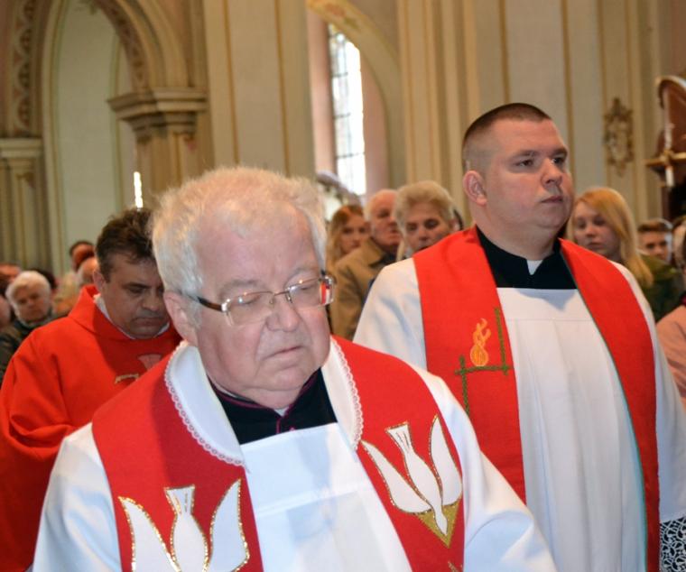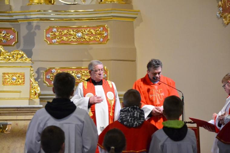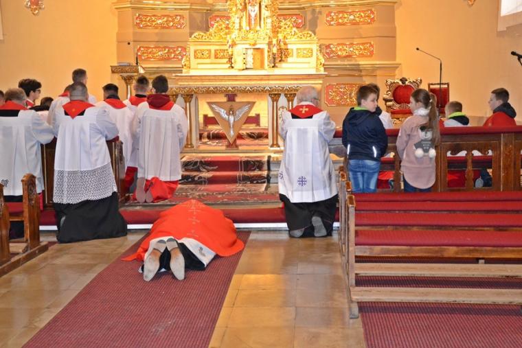 Liturgii Wielkopiątkowej przewodniczył ks. kan. Krzysztof Ordziniak. Niezwykła cisza i modlitewna zaduma zapanowała w kościele, gdy kapłan w tzw. geście właściwym Wielkiego Piątku leżał krzyżem przed ołtarzem. Podczas liturgii wielkopiątkowej odczytany został opis Męki i Śmierci Pana Jezusa. Podczas liturgii wielkopiątkowej kilka słów refleksji na temat krzyża w życiu człowieka skierował do licznie zebranych w świątyni wiernych ks. kan. Krzysztof. Kapłan zaakcentował, że Wielki Piątek jest dniem krzyża. Wskazał, że Kościół zatrzymuje się, aby ukazać ludziom cenę, za jaka Chrystus nas zbawił. Dodał jednak, że milczenie Wielkiego Piątku nie jest milczeniem rozpaczy, ale zadumy i refleksji nad miłością, która jest zdolna do największej ofiary. Kaznodzieja zachęcał zebranych do modlitwy i postawienia sobie pytania, czy potrafimy przyjąć krzyż. Krzyż, jak podkreślał, stoi w centrum Liturgii. Zwrócił uwagę na obnażony ołtarz, na którym brakuje obrusów, świeczników, kwiatów. Był natomiast pewien bardzo ważny gest. Powiedział: „celebrans(…) padł na twarz. To przejmujący znak modlitwy księdza leżącego na posadzce kościoła- jak podczas święceń kapłańskich. Trochę tak, jakby liturgia chciała nam przypomnieć, że bycie księdzem, bycie chrześcijaninem, jest powiązane z wejściem w tajemnicę Krzyża”. W dalszej części rozważania kapłan przywołał obraz znajdujący się w starym klasztorze. Przedstawia on Jezusa niosącego wielki krzyż, a wokół Niego wielu ludzi z małymi krzyżykami w ręku. Kapłan wskazał, że każdy człowiek ma swój krzyż. Podkreślił, że autor tego obrazu chciał ludziom przypomnieć słowa Chrystusa: „ Jeśli kto chce pójść za Mną, niech się zaprze samego siebie, niech weźmie krzyż swój i niech Mnie naśladuje”. Kontynuując, ks. proboszcz Krzysztof podkreślał potrzebę podjęcia swego krzyża i podążania z nim za Chrystusem. Wskazał na wielorakość i różnorodność krzyży, które trzeba przyjąć w swoim życie. Jest ich tak wiele, jak wielu jest ludzi. Zwrócił uwagę na krzyż samotności, zdrady, odrzucenia, choroby, nieszczęśliwych wypadków, śmierci bliskich. Kontynuując powiedział: „Krzyż ma wiele imion. Jedno jest pewne: trzeba podjąć swój krzyż, aby upodobnić się do Chrystusa. Kto nie bierze swego krzyża, nie jest Mnie godzien - mówi Jezus”. Kapłan zwrócił uwagę wiernych, że aby zrozumieć i podjąć swój krzyż, trzeba zrozumieć krzyż Chrystusa. To z niego mamy czerpać siłę i moc. W końcowej części rozważania kapłan przywołał postać Karola Antoniewicza, autora pieśni: „ W krzyżu cierpienie, w krzyżu zbawienie…”. Wskazał trudne koleje jego życia: śmierć dzieci, żony. Jego żona w czasie choroby mówiła do niego: „Karolu, trzeba głośno dziękować, a cicho cierpieć”. Po jej śmierci wstępuje do jezuitów. Ma dar przemawiania do cierpiących. W czasie epidemii z wielkim oddanie posługuje chorym. Sam się zaraża i tuż przed śmiercią pisze pieśń „ W krzyżu cierpienie, w krzyżu zbawienie, w krzyżu miłości nauka…”