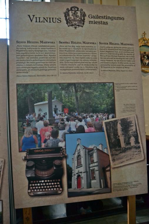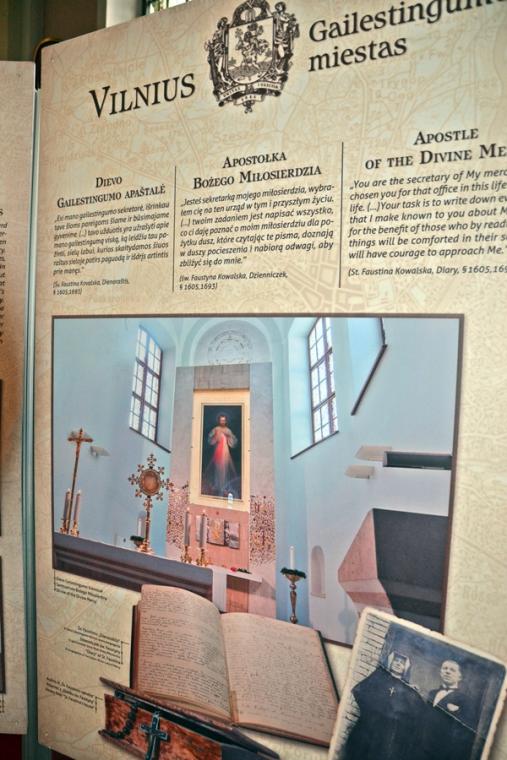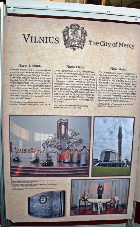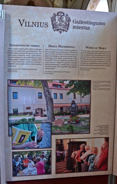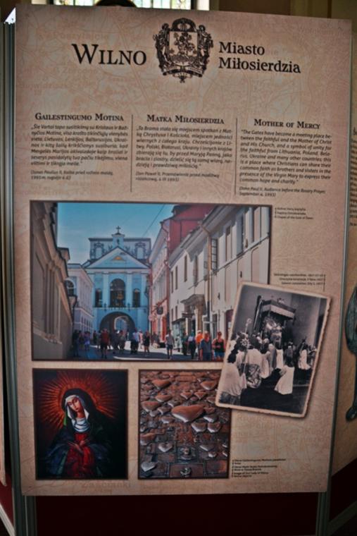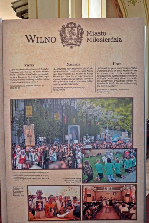 Ponadto w lipcu organizowana jest z parafii pielgrzymka do Wilna. Wystawa ma więc zachęcić do wyruszenia na pielgrzymi szlak, a tym którym nie będzie to dane przybliżyć miejsca związane z kultem Bożego miłosierdzia. Jest ich jak możemy się przekonać oglądając wystawę bardzo wiele. Pomysłodawcą wystawy jest ks. Mariusz Marszałek, były sekretarz ks. Abp Wilna Gintarasa Grusasa. Po raz pierwszy została zaprezentowana w Senacie w 2016 roku. Autorem zdjęć jest artysta i fotograf Marian Dzwinel. Wystawa składa się z 16 plansz, na których umieszczone są zdjęcia i teksty w trzech językach polskim, litewskim, i angielskim. Oto niektóre tytuły prezentowanych na wystawie plansz: Apostołka Bożego Miłosierdzia, Święta Faustyna w Wilnie, Matka Miłosierdzia, Nadzieja, Dzieła Miłosierdzia, Na drogach Bożej Opatrzności, Obraz Jezusa Miłosiernego, Nowe zgromadzenia, Krzyż wyrazem Bożego miłosierdzia i kilka innych. Na jeszcze jedną chcemy zwrócić uwagę – Nowa iskra, a na niej Sanktuarium Miłosierdzia Bożego i tekst Aktu zawierzenia losu świata Miłosierdziu Bożemu przez św. Jana Pawła II. Dodajmy, że każda plansza zawiera opis miejsca, bądź fragment z Dzienniczka św. S. Faustyny, czy pamiętnika, listów bł. Michała Sopoćko.