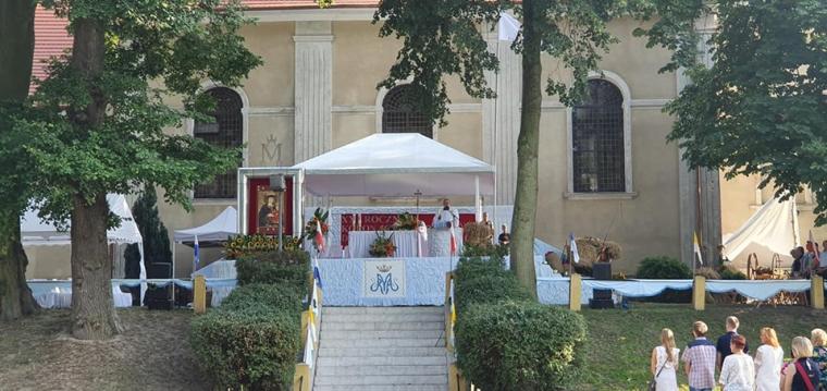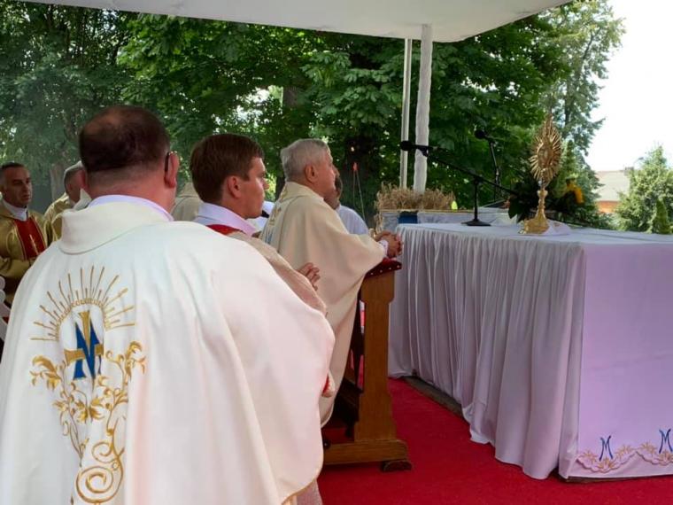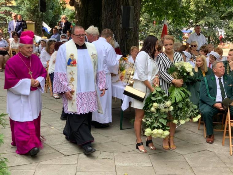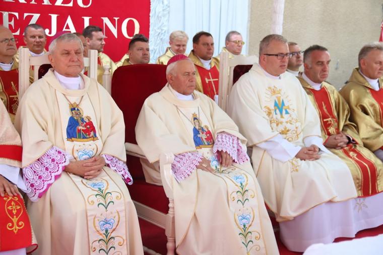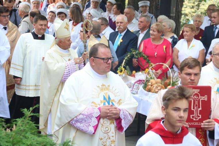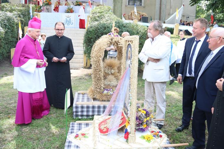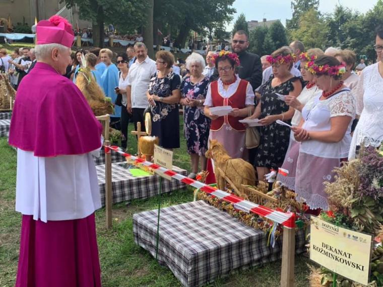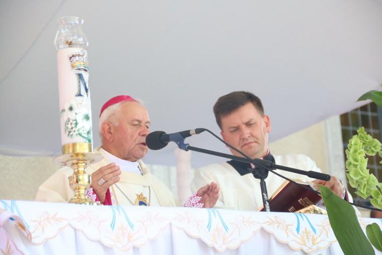 który przewodniczył Pontyfikalnej Sumie Odpustowej i dziękczynnej za tegoroczne plony podczas dożynek diecezjalno ~ powiatowych w Lutogniewie. Uroczystość połączono z dziękczynieniem za XX Rocznicę Koronacji Obrazu Matki Bożej Pocieszenia. Do Sanktuarium Matki Bożej Pocieszenia od wczesnego rana przybywali pielgrzymi w pieszych i autokarowych pielgrzymkach wraz ze swoimi duszpasterzami z terenu całej diecezji kaliskiej. Przed Eucharystią biskup kaliski Edward Janiak obejrzał wieńce dożynkowe przywiezione przez delegacje rolników z trzydziestu trzech dekanatów diecezji kaliskiej. Biskup podziwiał trud pracy, który rolnicy włożyli w przygotowanie wieńców. Mszy świętej dziękczynnej przewodniczył pierwszy biskup kaliski Stanisław Napierała. Wraz z Nim modlili się biskup kaliski Edward Janiak, ks. kan. Łukasz Żurawski, kustosz Sanktuarium Matki Bożej Pocieszenia w Lutogniewie. W swoim słowie biskup kaliski wspominał, że 20 lat temu jako biskup pomocniczy archidiecezji wrocławskiej uczestniczył w uroczystości koronacji obrazu Matki Bożej Pocieszenia. „Księże Biskupie Stanisławie to Twoim staraniem te korony otrzymała wtedy Matka Boża.” ~ powiedział biskup kaliski Edward Janiak.
